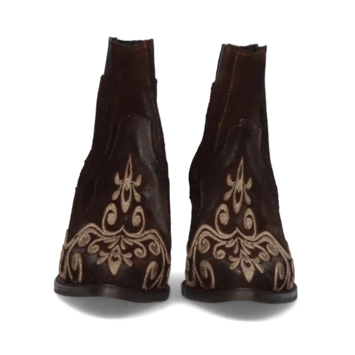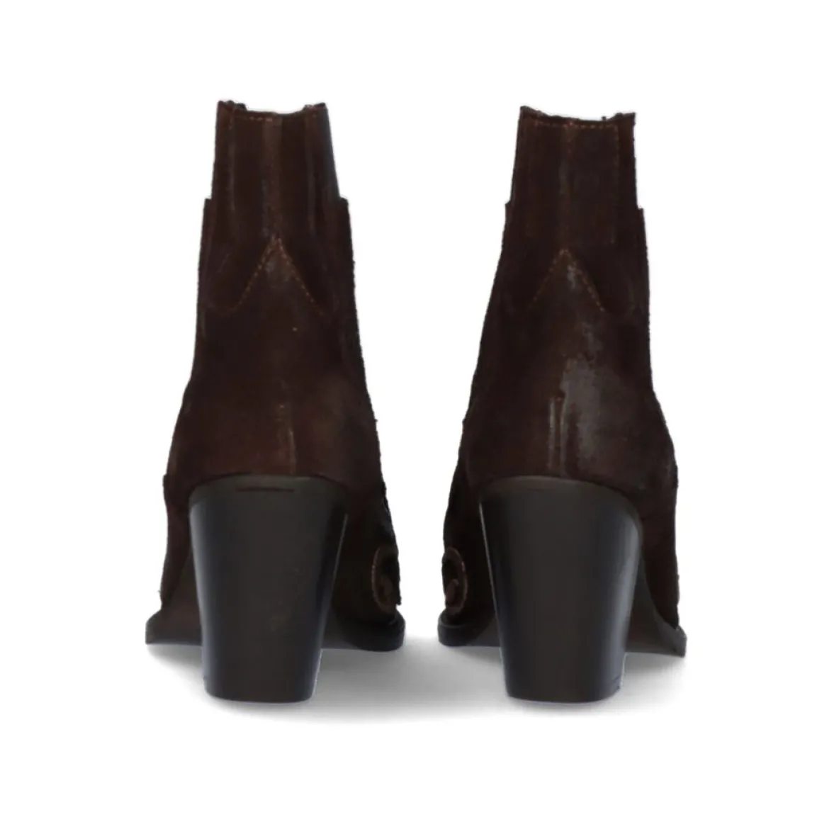 Bota Marrom Com Salto Estilo Cowboy Com Detalhes Bornze No Peito Do Pe E Detalhe De Efeito Borracha No Tornozelo. Composto Por Cabedal Em Camurca, Palmilha Em Couro E Solado Sintetico.