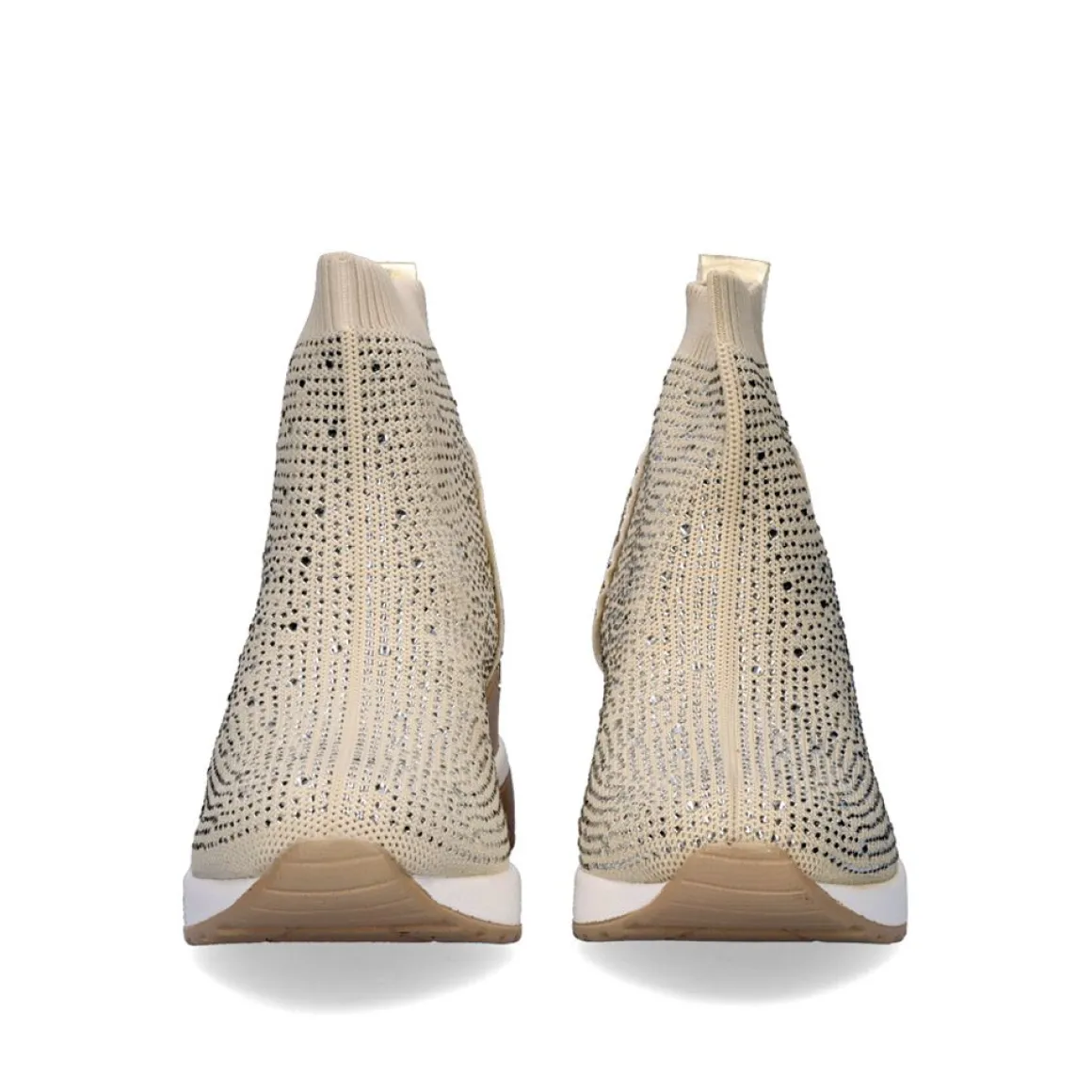 Botas De Tornozelo De Cor Dourada Estilo Meia Com Pedras De Strass A Volta E Detalhes Dourados Nas Costas. A Altura Da Cunha E De 6,5 Cm E Os Materiais Da Composicao Da Sola Sao Sinteticos.
