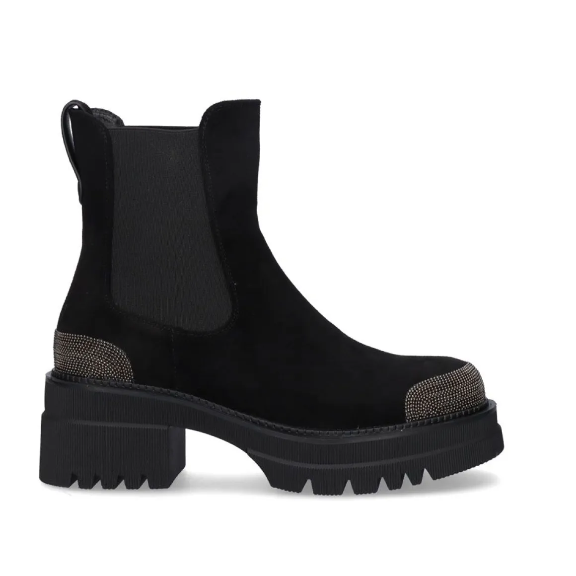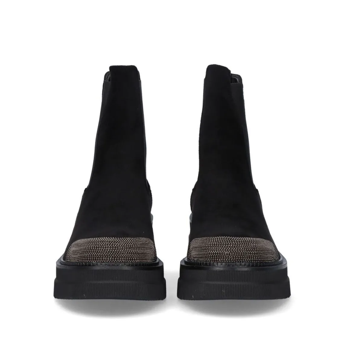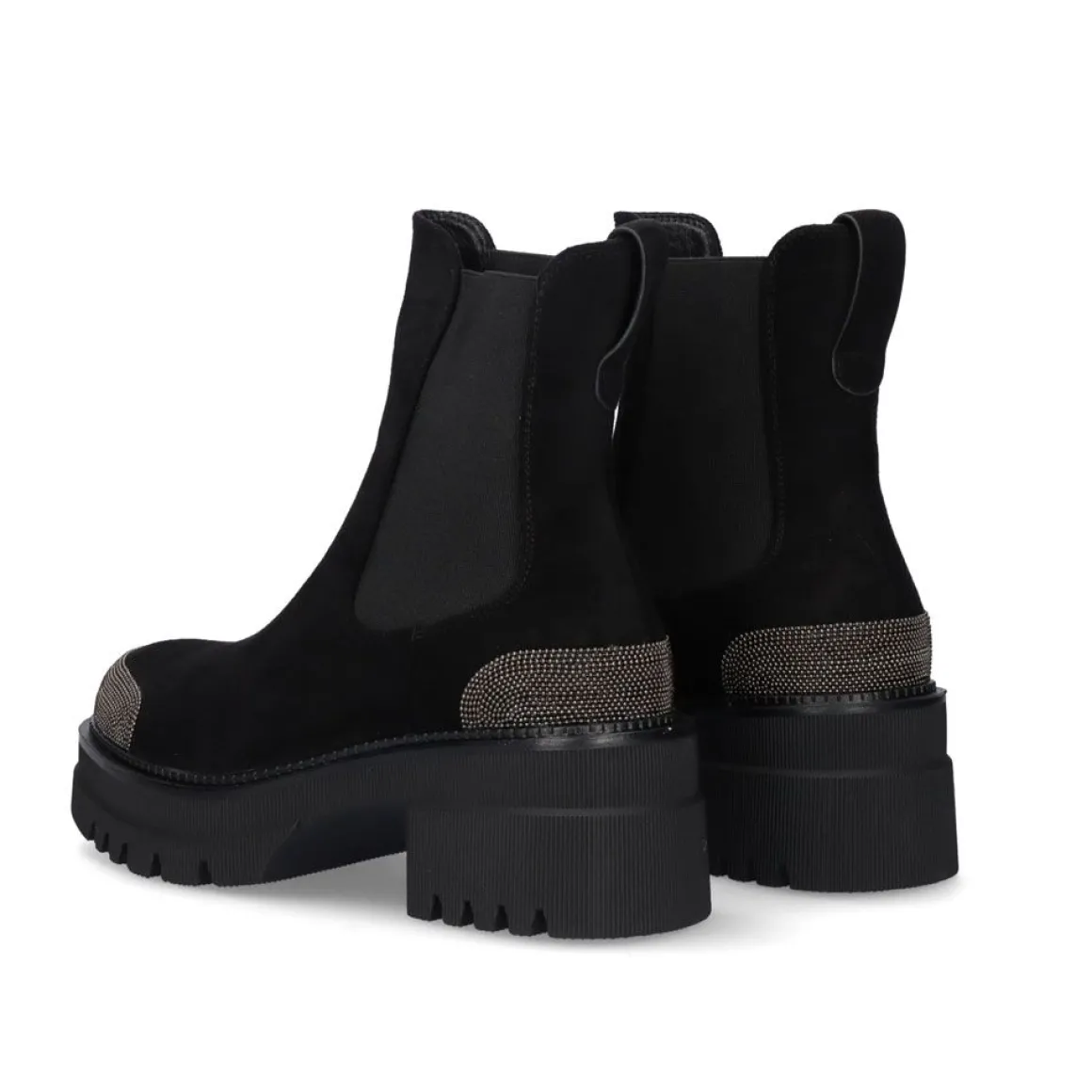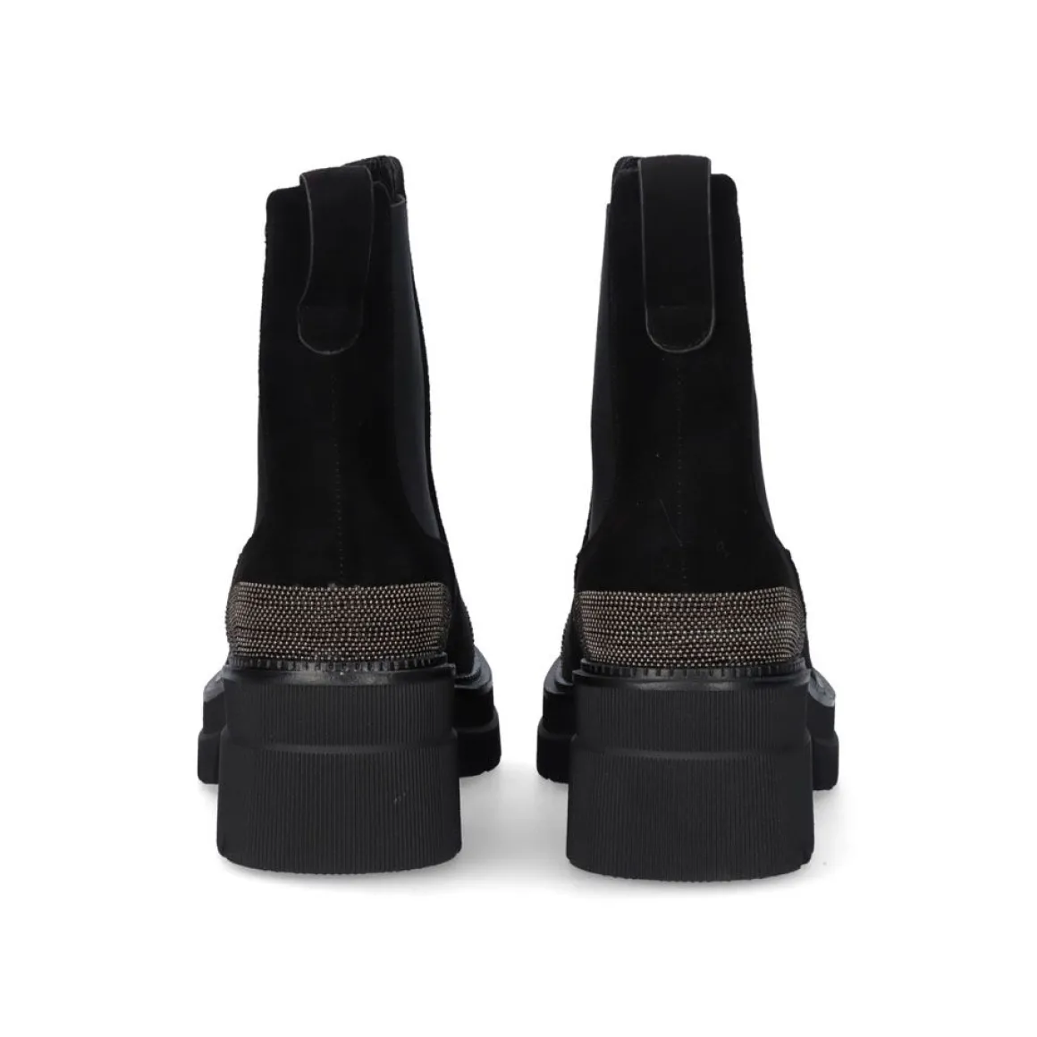 Botins De Sola Grossa Com Elasticos Nas Laterais Em Preto. O Seu Corte E Sola Sao Feitos De Material Textil E A Sua Sola E Feita De Material Sintetico. O Material Cortado E De Toque Suave E Tem Ornamentos Na Ponta E No Calcanhar Na Cor Prata Na Forma De Uma Corrente Fina. Sua Bengala Mede 14,5 Cm E A Sola Mede 6 Cm Na Area Do Calcanhar E 3,5 Na Area Do Dedo Do Pe.