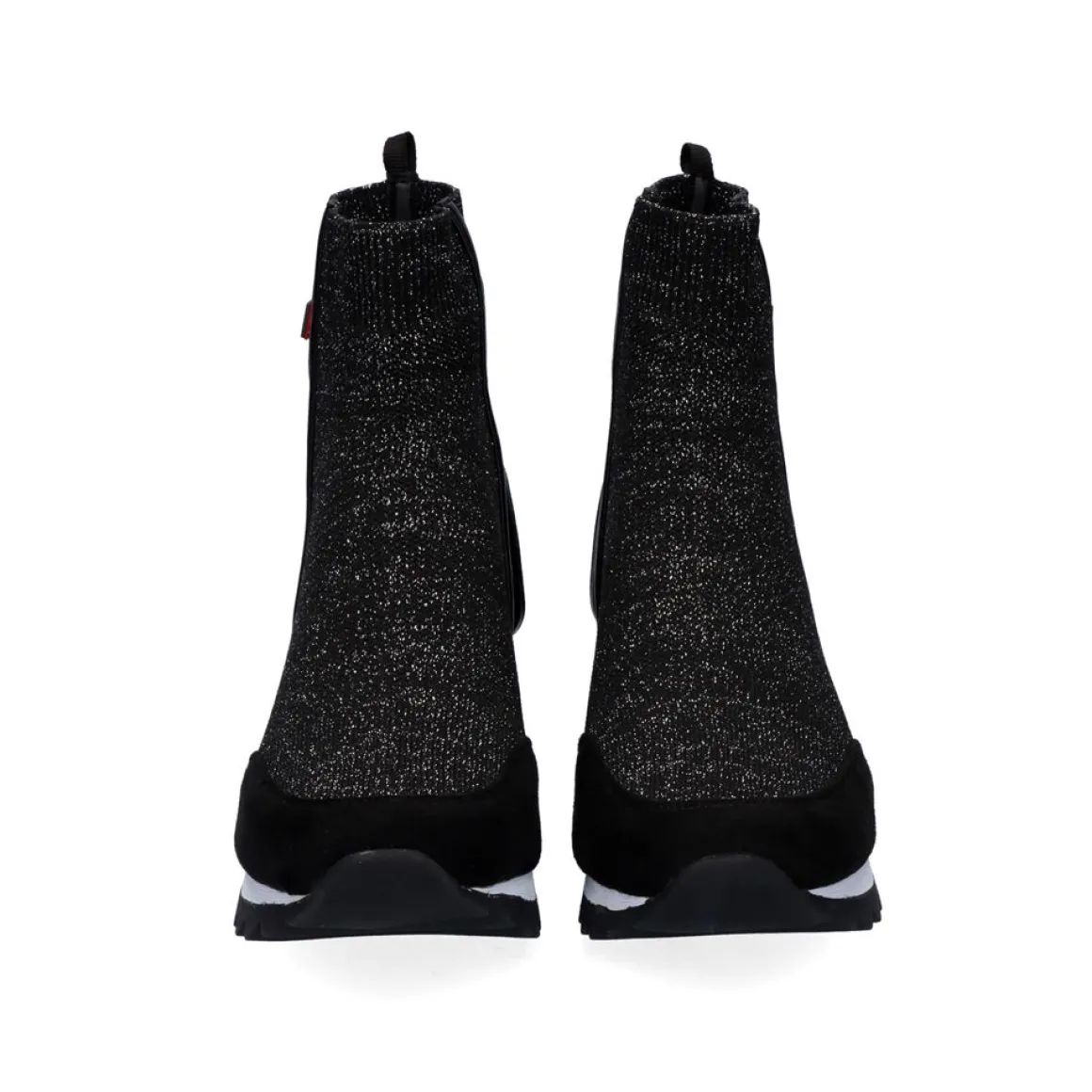 Botas De Tornozelo Estilo Meia Em Preto E Detalhes Brilhantes. Altura Da Plataforma 7,5 Cm E Eixo De 11,5 Cm. Sao Feitos Com A Parte Superior Brilhante, Sola Sintetica E Sola Textil.