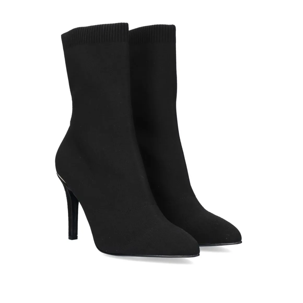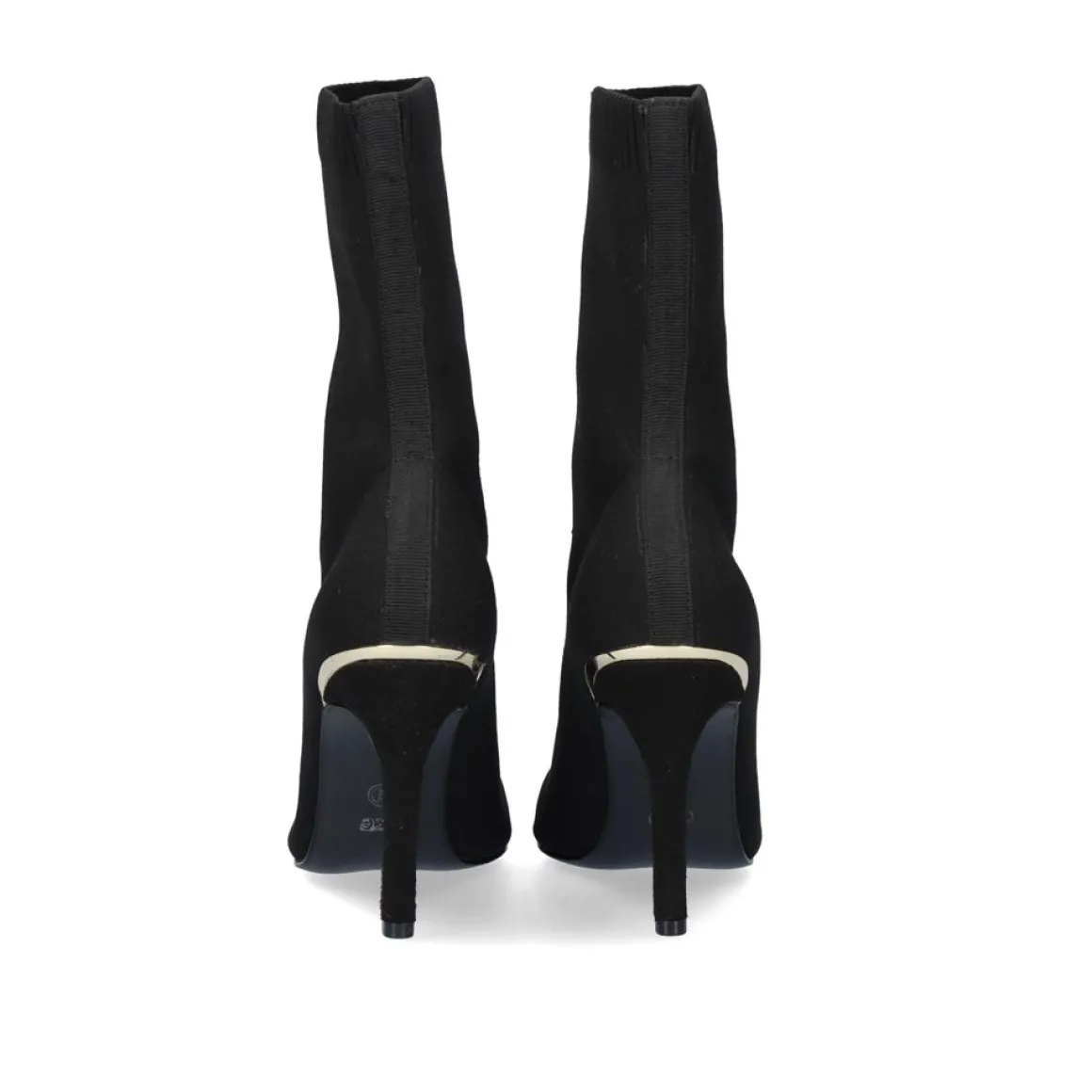 Botins Estilo Meia Em Preto. Seu Corte E Feito De Material Textil, Sua Palmilha E Feita De Couro E A Sola De Material Sintetico. A Bengala Tem Uma Altura De 17,5 Cm E O Seu Calcanhar Mede 9,5 Cm. Alem Disso, Tem Um Ornamento Metalico Dourado No Calcanhar.