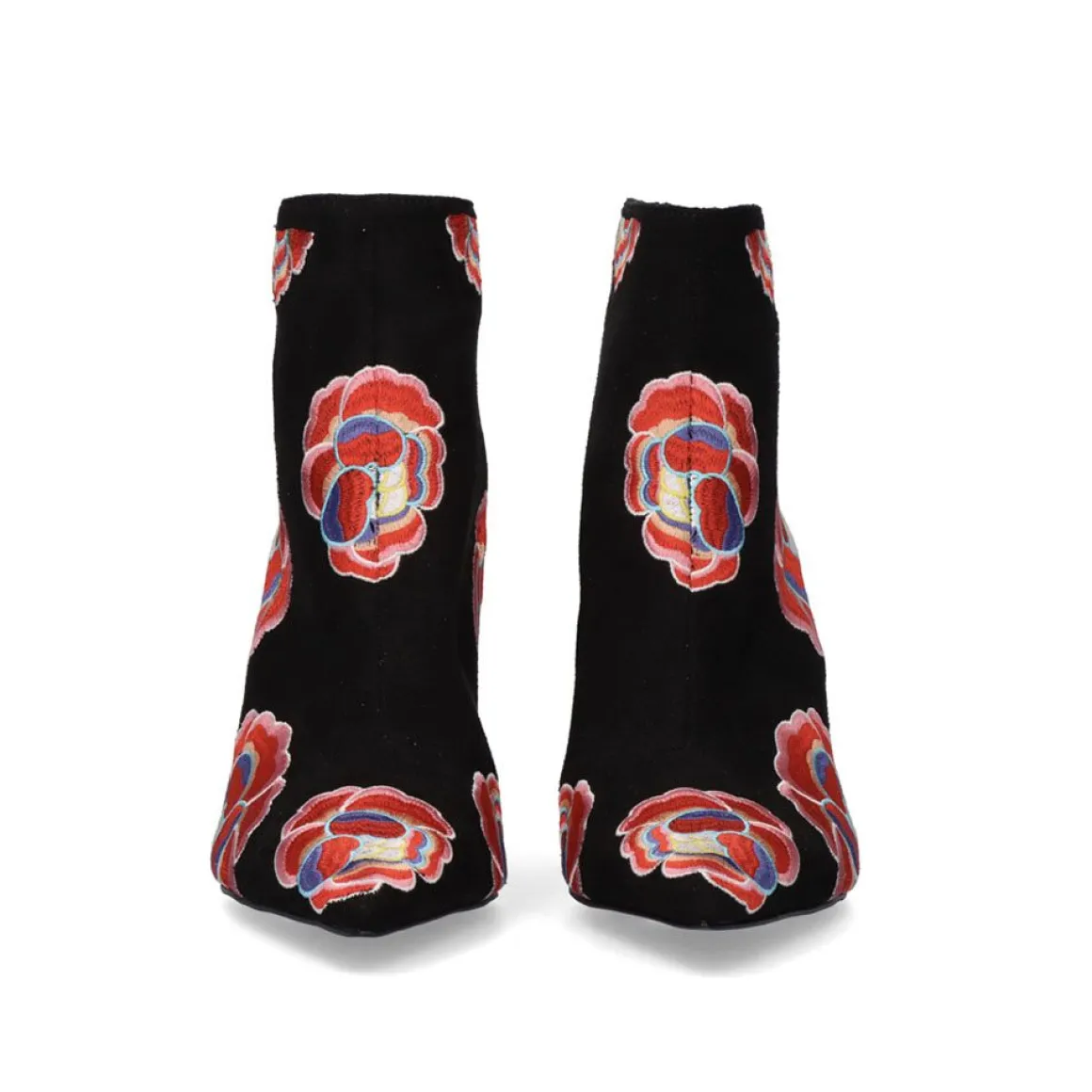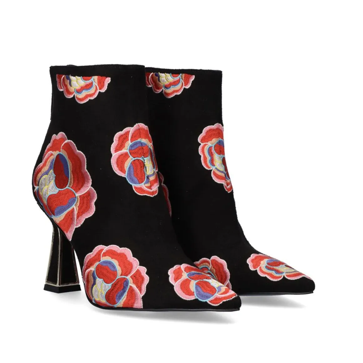 Botins De Salto (>8 Cm) Quadrado De 9 Cm Em Preto. Seu Corte E Sola Sao Feitos De Material Sintetico, A Palmilha E Feita De Couro. Tem Um Ornamento Bordado Floral Colorido E Um Detalhe Metalico Decorativo No Calcanhar. Alem Disso, A Altura De Sua Bengala E De 12,Medio E Tem Um Fecho De Ziper.