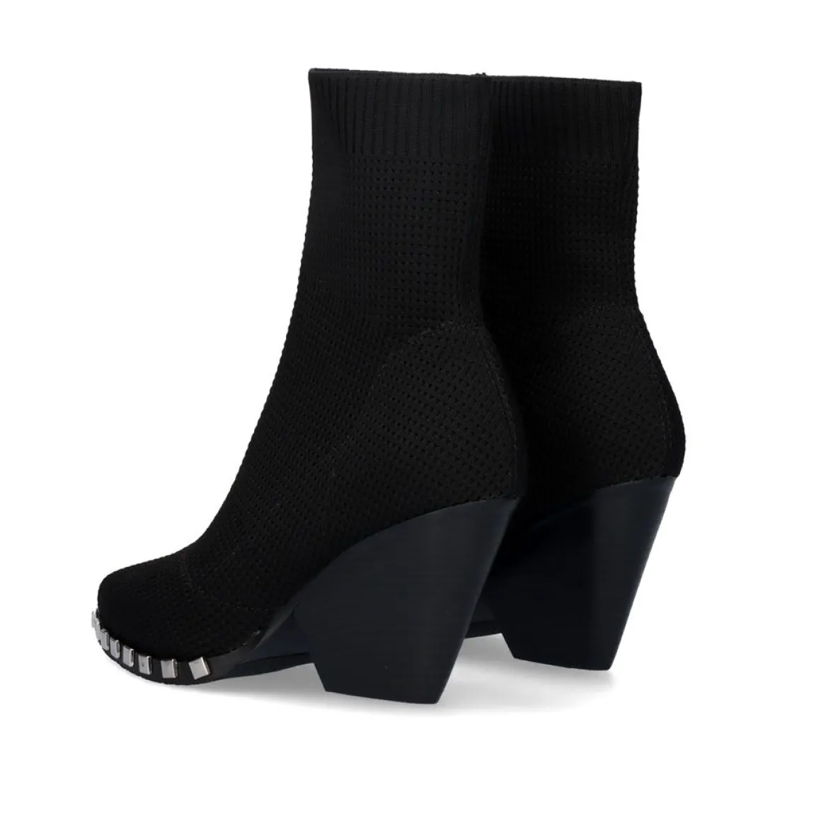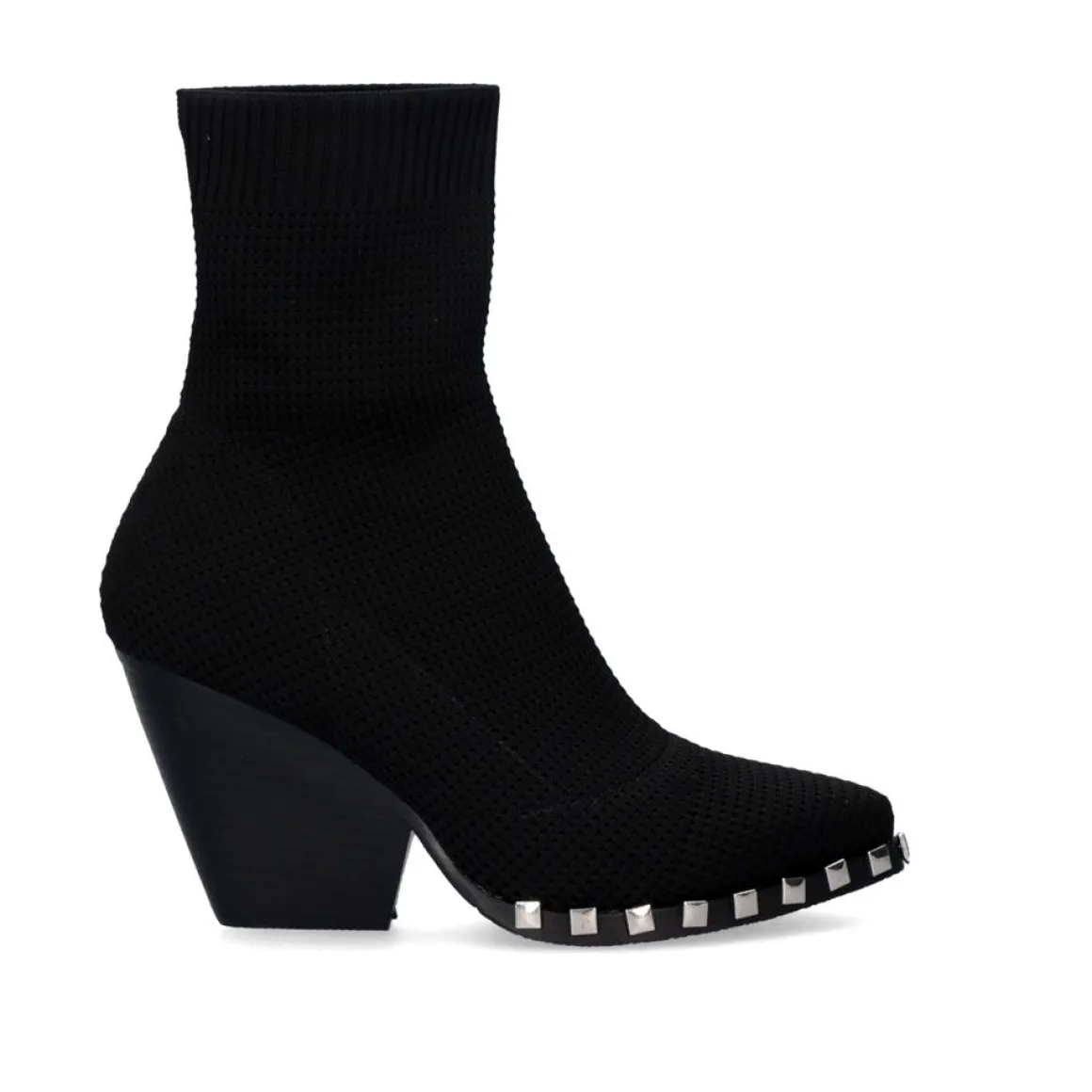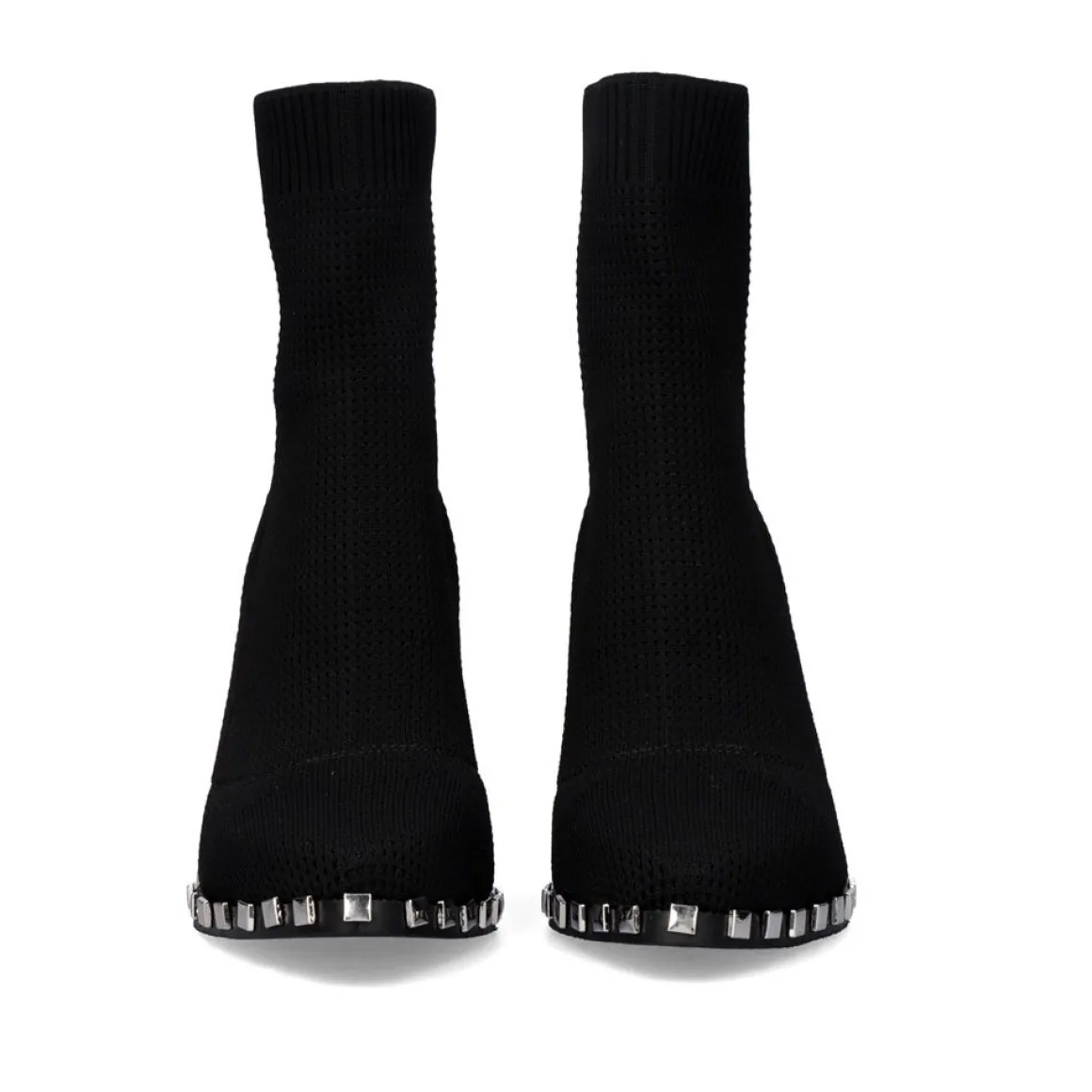 Botins Estilo Meia Em Preto. Seu Corte E Palmilha Sao Feitos De Material Textil, Sua Sola E Feita De Material Sintetico. Tem Um Salto (>8 Cm) De 9 Cm E Uma Bengala Com 16 Cm De Altura. Alem Disso, Possui Pregos Decorativos Prateados Na Borda Da Sola.