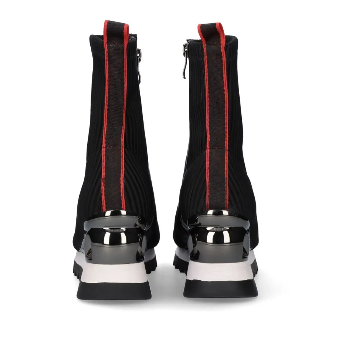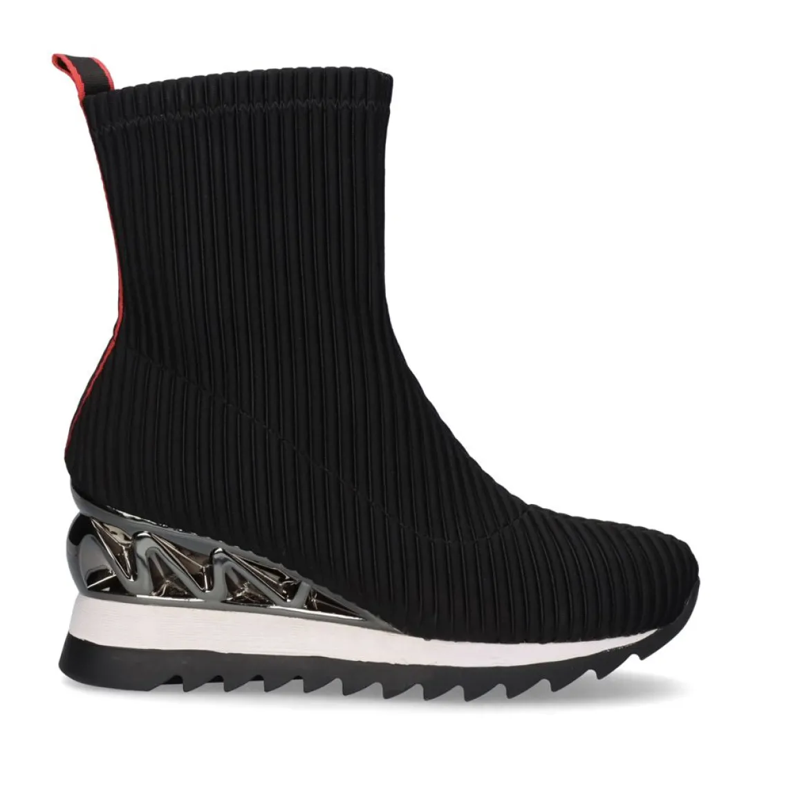 Botins De Lycra Pretos. Seu Corte E Palmilha Sao Feitos De Material Textil, A Sola E Feita De Material Sintetico. Sua Cunha Mede 7,Medio E Tem Um Fecho Com Ziper. A Cana Tem 1Medio De Altura.