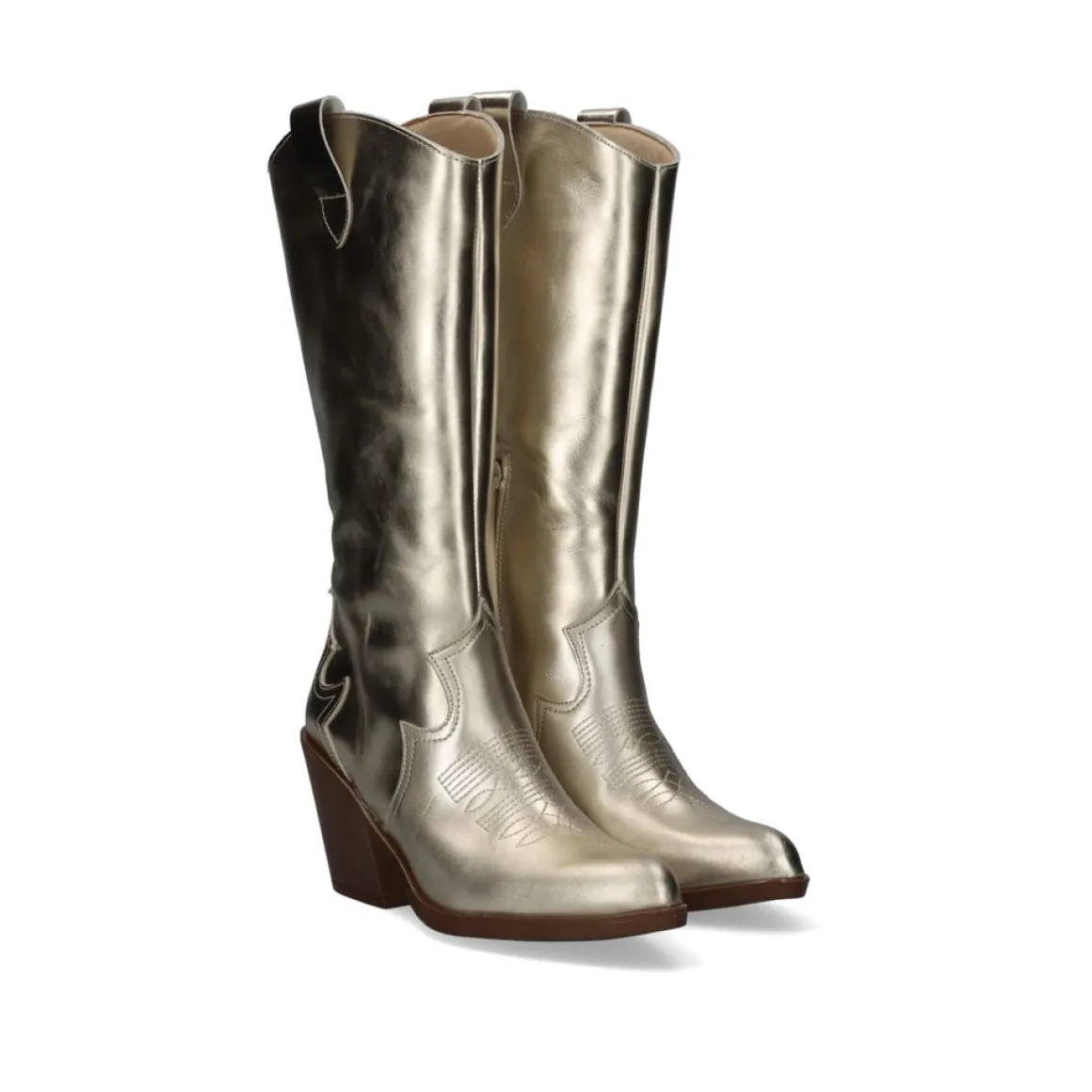 Bota De Cowboy Dourada Com Salto De 8 Cm De Altura E Dois Detalhes Ao Tom Em Sua Bengala De 27 Cm. Seu Material De Corte E Palmilha Sao Sinteticos, Alem Disso, A Sola Tambem E Feita De Material Sintetico. Tem Um Bordado Decorativo No Peito Do Pe E Tem Um Fecho De Ziper.