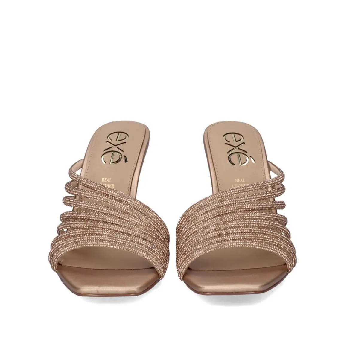 Sandalia De Salto Em Ouro Rosa. Seu Corte Na Forma De Tiras De Material Strass E Sua Sola Sao Feitas De Material Sintetico, A Palmilha E Feita De Couro. Tem Um Salto De 9 Cm.