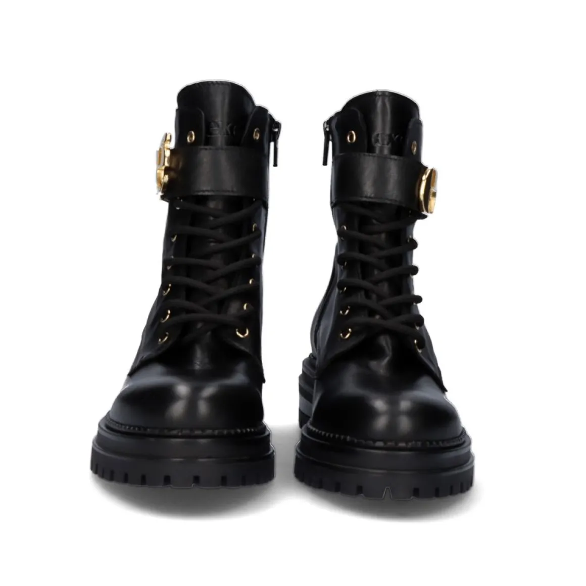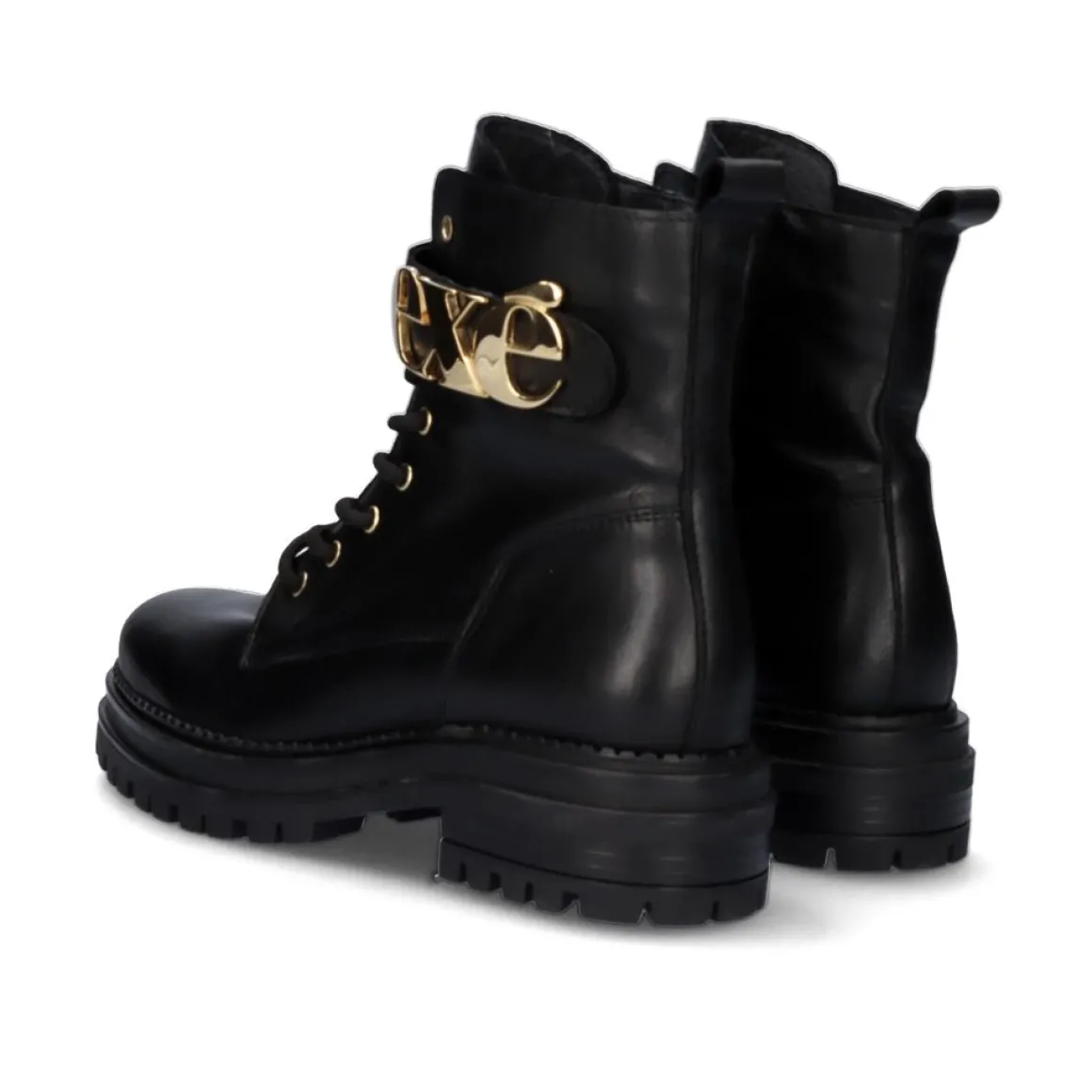Botina Estilo Militar Em Preto Com Detalhe De Letras “Exe” Em Dourado E Fechamento De Ziper Lateral. Altura Da Vara De 14,4 Cm , O Salto De 4,4 Cm E Altura Da Ponta De 2,8 Cm.