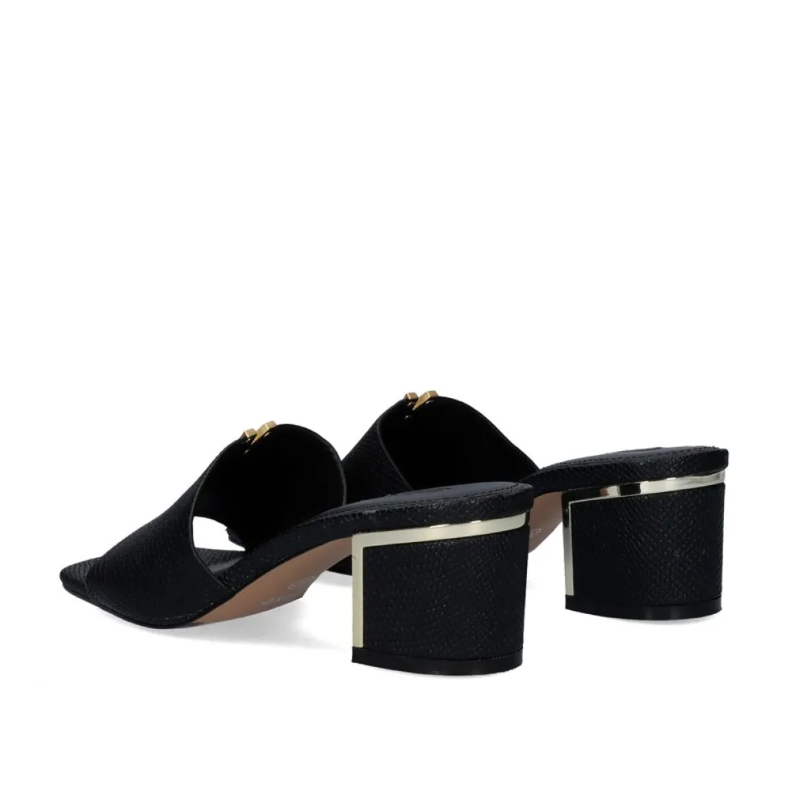 Sandalia Cano Baixo Tipo Mule Com Estampa De Cobra Preta Com Detalhe Metalizado. A Altura Do Salto E De 5 Cm.