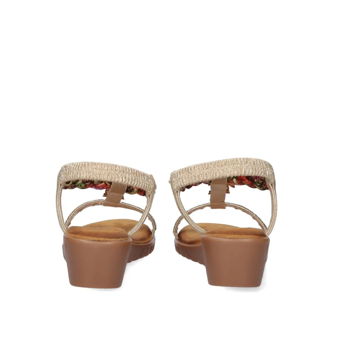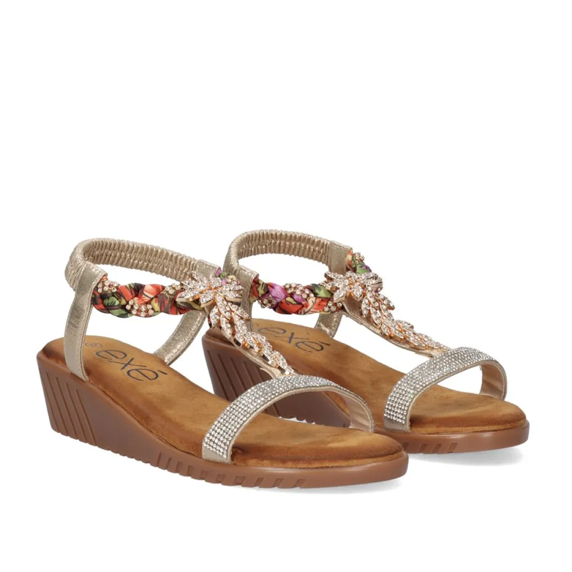 Cunha Na Cor Dourada Com Brilhantes Decorativos. Seu Corte E Sola Sao Feitos De Material Sintetico, A Palmilha E Feita De Material Textil. Tem Um Elastico De Tornozelo Como Um Fechamento E Uma Cintura De 4 Cm.