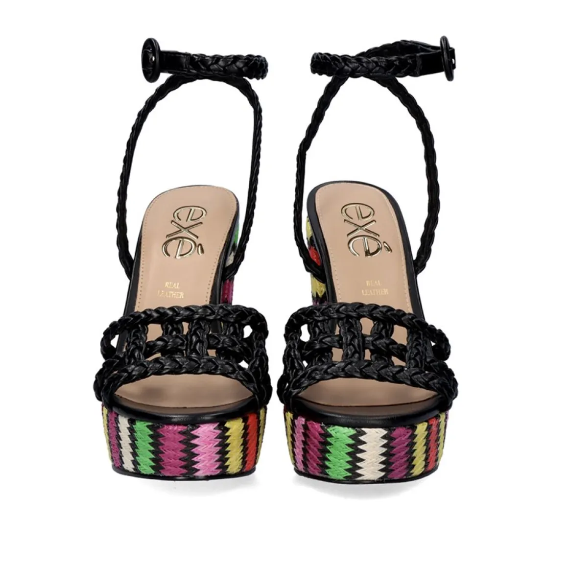 Sandálias Feitas De Material Sintetico Com Salto Multicolorido E Plataforma. O Pe E Preso Por Tiras Compostas De Material Textil Trancado E Tem Um Fechamento De Fivela No Tornozelo. Altura Do Calcanhar De 12 Cm, Plataforma De 4 Cm E Modelo De Couro.