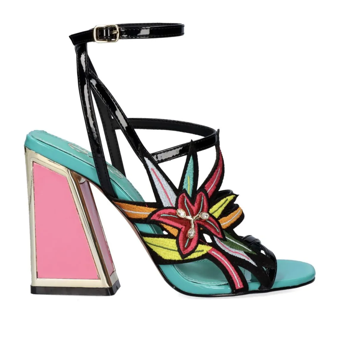 Sandalia Na Cor Preta E Salto De 11 Cm. Apresenta Um Ornamento Brilhante E Fecho De Fivela. Seu Corte E Sola Sao Feitos De Material Sintetico, A Palmilha E De Couro.