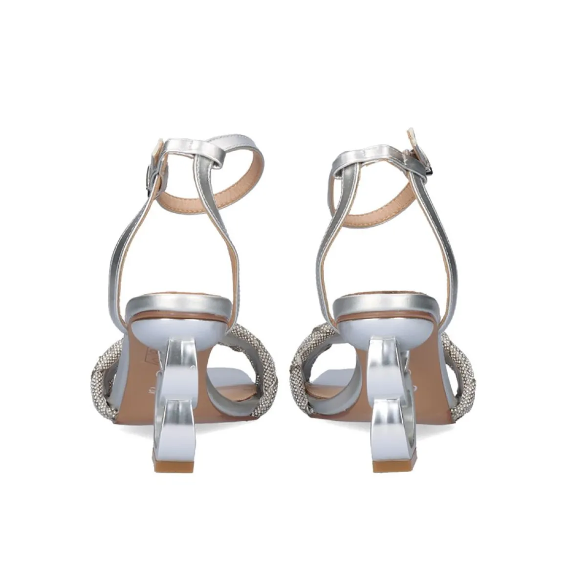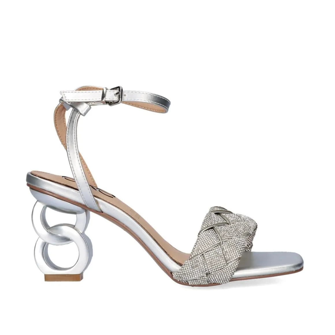 Sandalia De Salto Baixo Com Fecho Com Fivela No Tornozelo E Para Formada Por Varias Tiras Brilhantes Trancadas. Seu Calcanhar De Formas Circulares Vai Para O Tom Da Cor Da Pa. A Altura Do Salto E De 7,5 Cm.