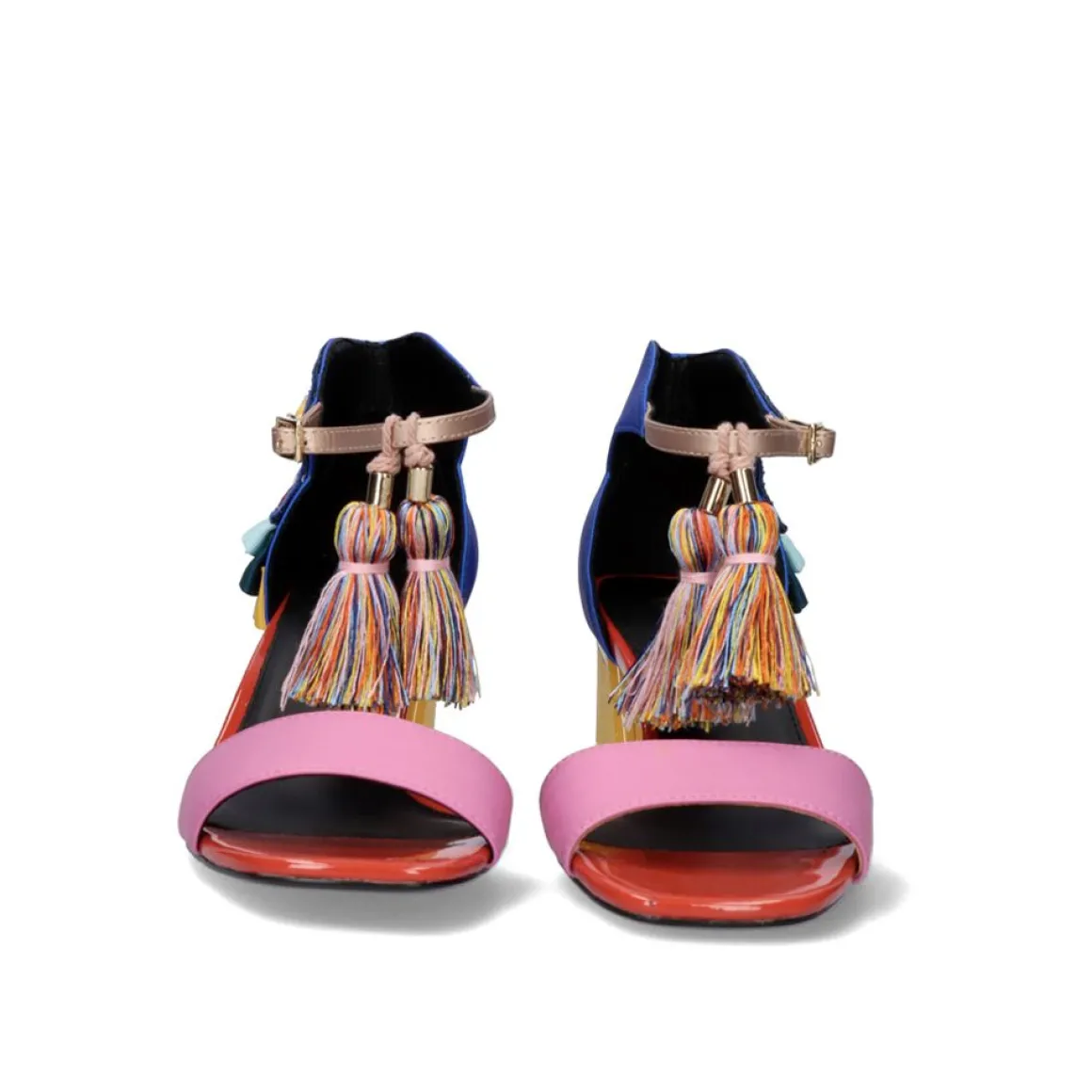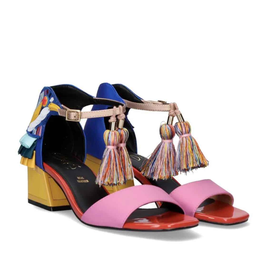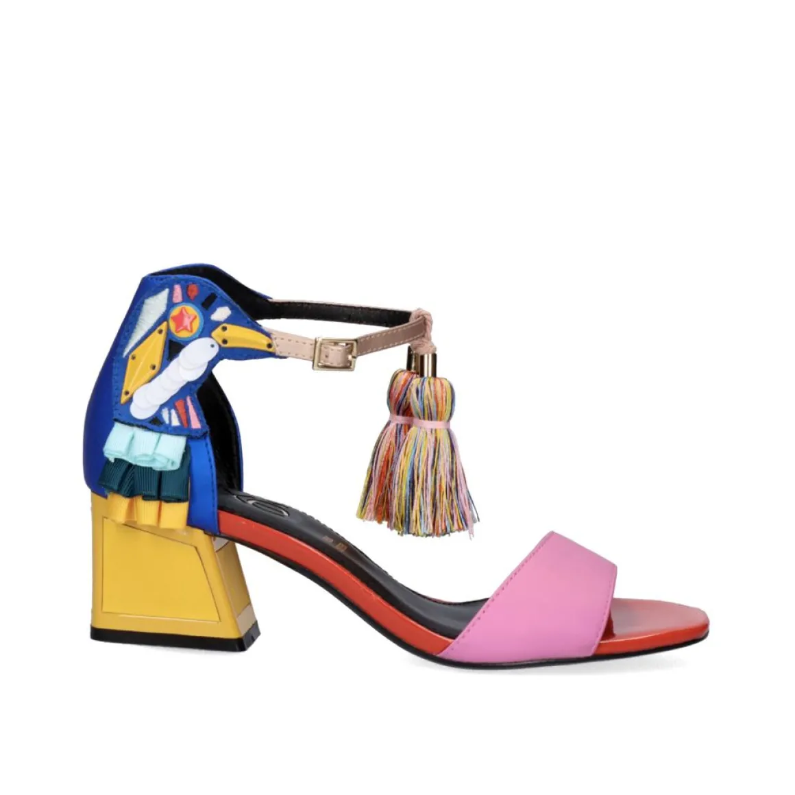 Sandalia Feita De Material Sintetico Com Salto Baixo E Fecho Da Fivela. Seus Ornamentos No Calcanhar Formam Um Papagaio E Da Faixa De Fechamento Pendura Um Tassel. Altura Do Calcanhar De 3 Cm E Palmilha De Couro.