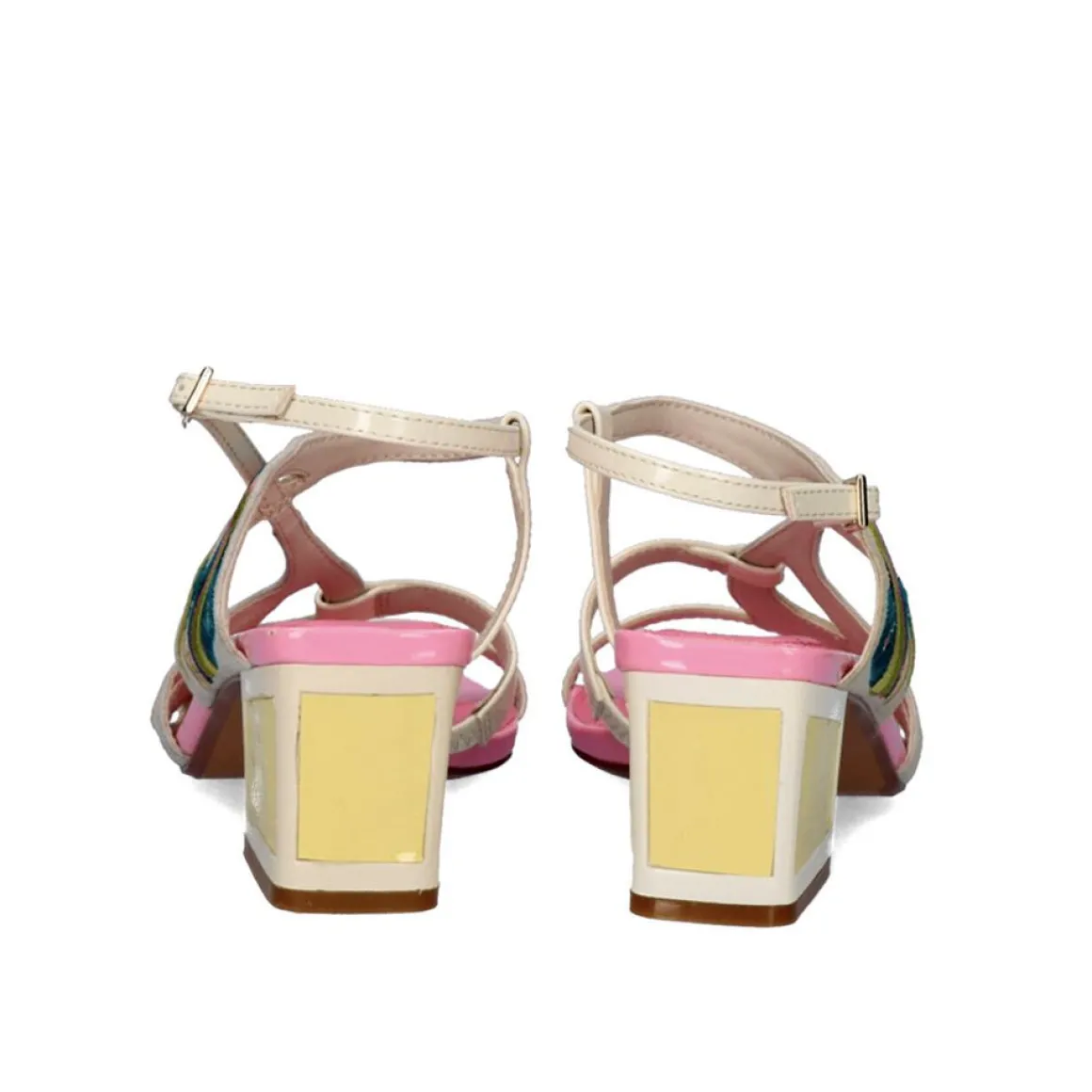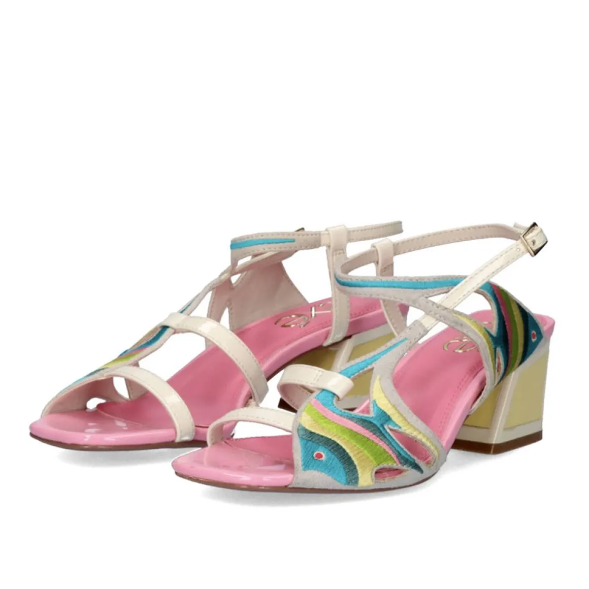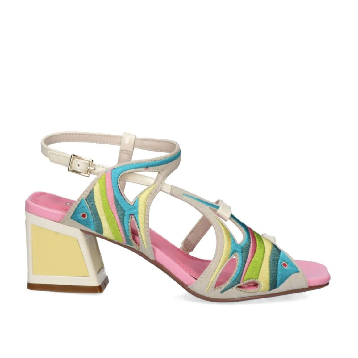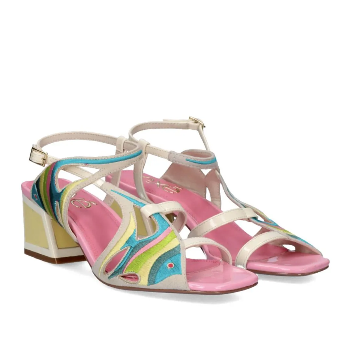 Sandalia Feita De Material Sintetico Com Salto Baixo E Fecho Da Fivela. Suas Tiras Tem Dois Bordados Em Forma De Peixe. Altura Do Calcanhar De 3 Cm E Palmilha De Couro.