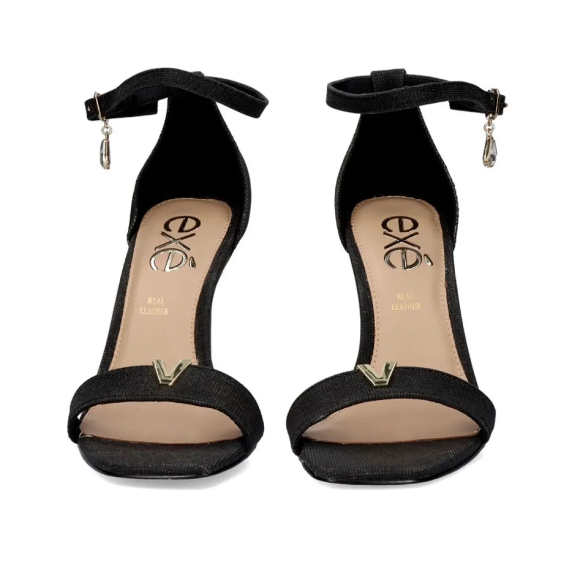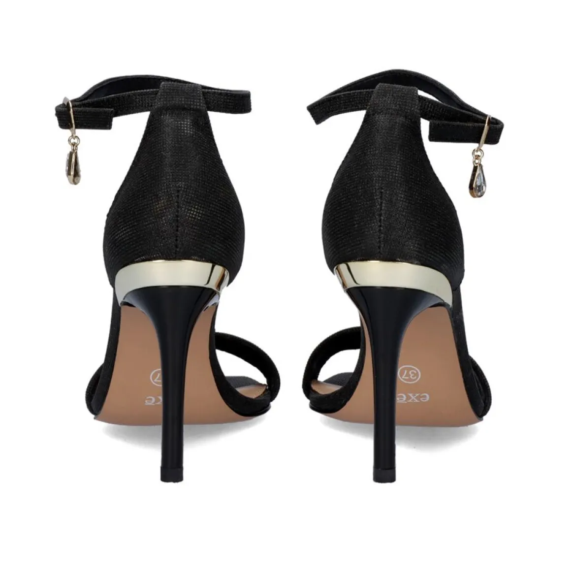 Sandalia Feita De Material Sintetico Com Salto Medio E Fino. Sua Alca Dianteira Possui Uma Guarnicao Dourada E O Fechamento Do Tornozelo Apresenta Uma Fivela Dourada Da Qual Pendura Uma Lagrima De Cristal. Altura Do Calcanhar De 9,5 Cm E Palmilha De Couro.