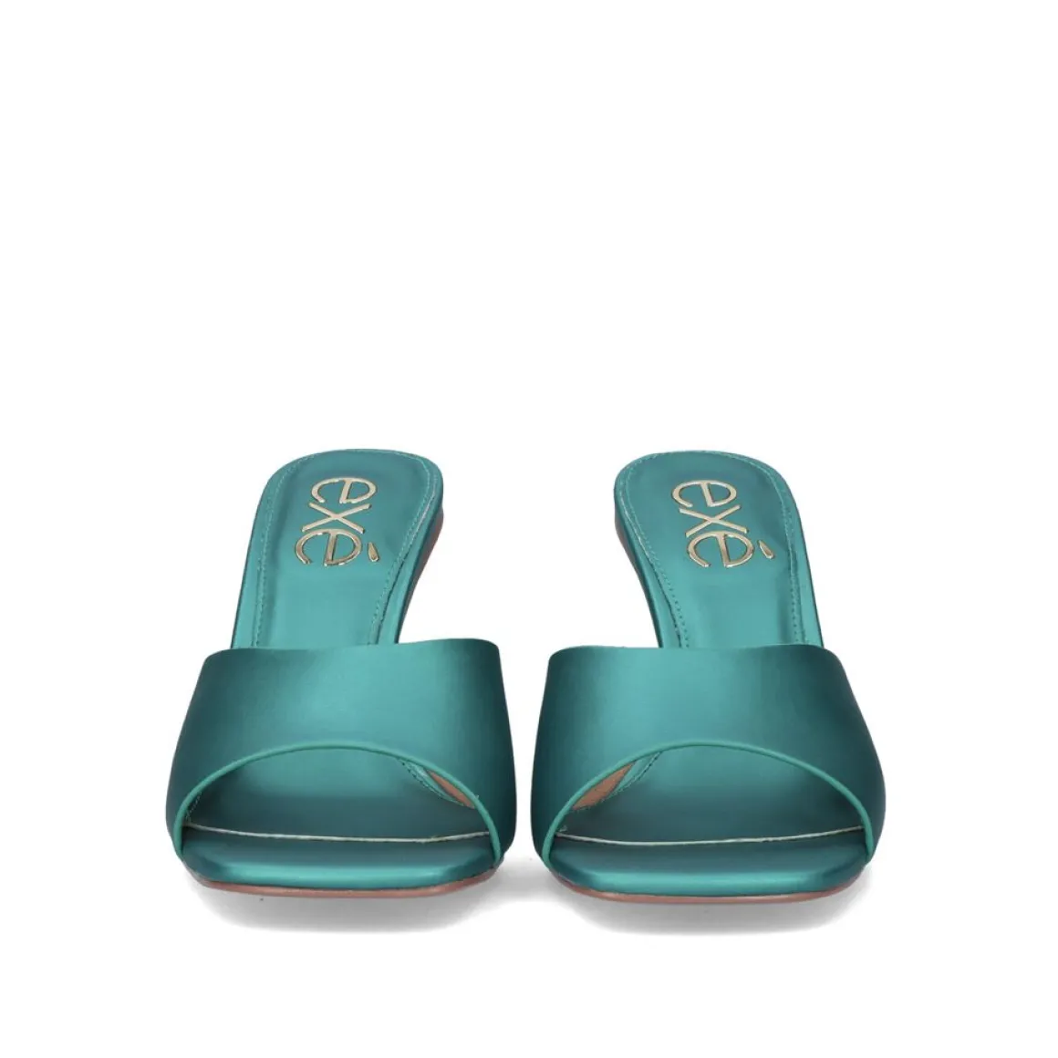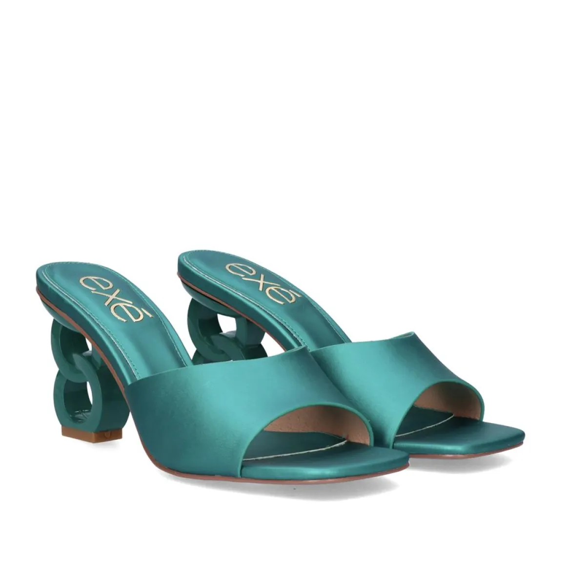Sandalia De Salto Na Cor Verde. Seu Corte E Sola Sao Feitos De Material Sintetico, A Palmilha E De Couro. O Calcanhar Mede 7,5 Cm E Nao Tem Fechamento.