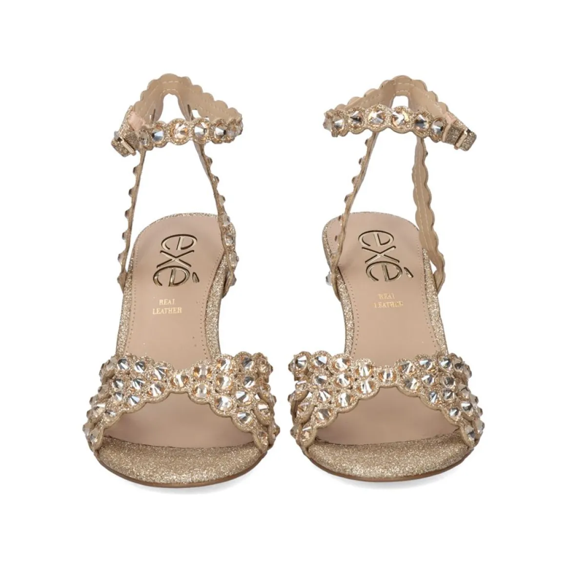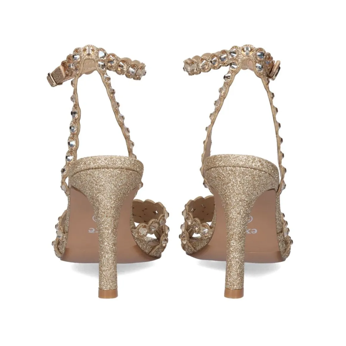 Sandalia Glitter Com Brilhantes Na Cor Dourada. Seu Corte E Sola Sao Feitos De Material Sintetico, A Palmilha E De Couro. Tem Um Fecho De Fivela De Tornozelo E Um Calcanhar De 9 Cm.