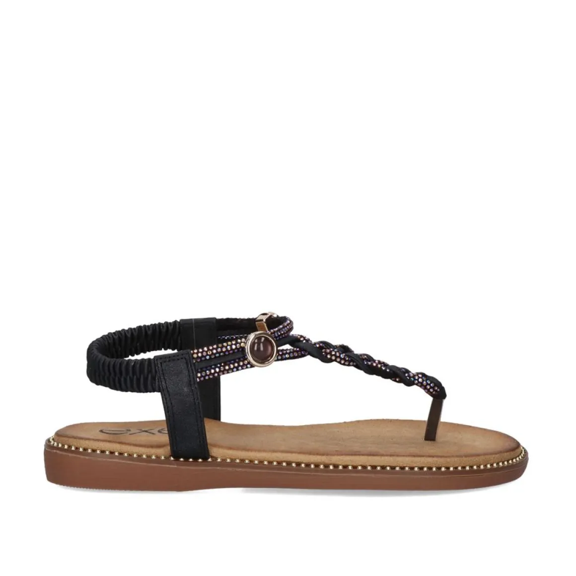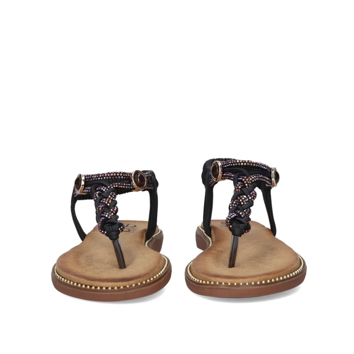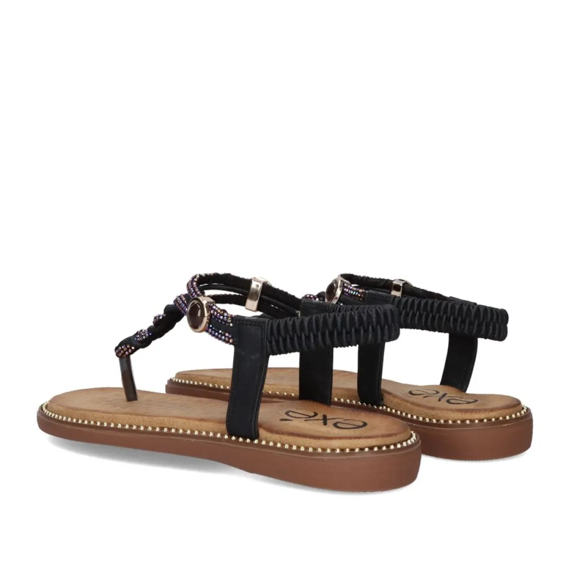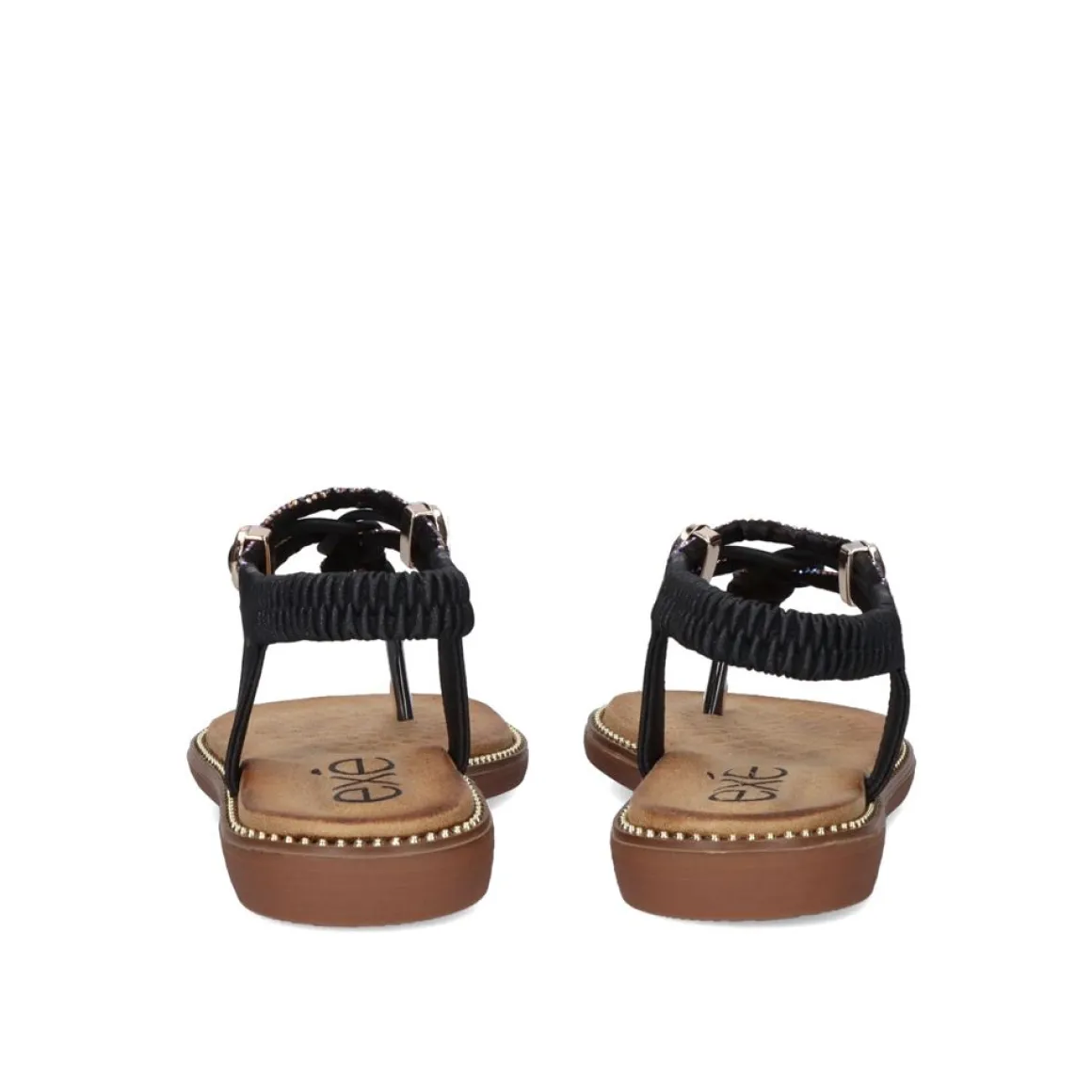 Sandalia Plana Em Preto. Seu Corte E Textil, Palmilha E Sola Sao Feitas De Material Sintetico. E Segurado Ao Pe Por Uma Tira Elastica Na Parte De Tras Do Tornozelo.