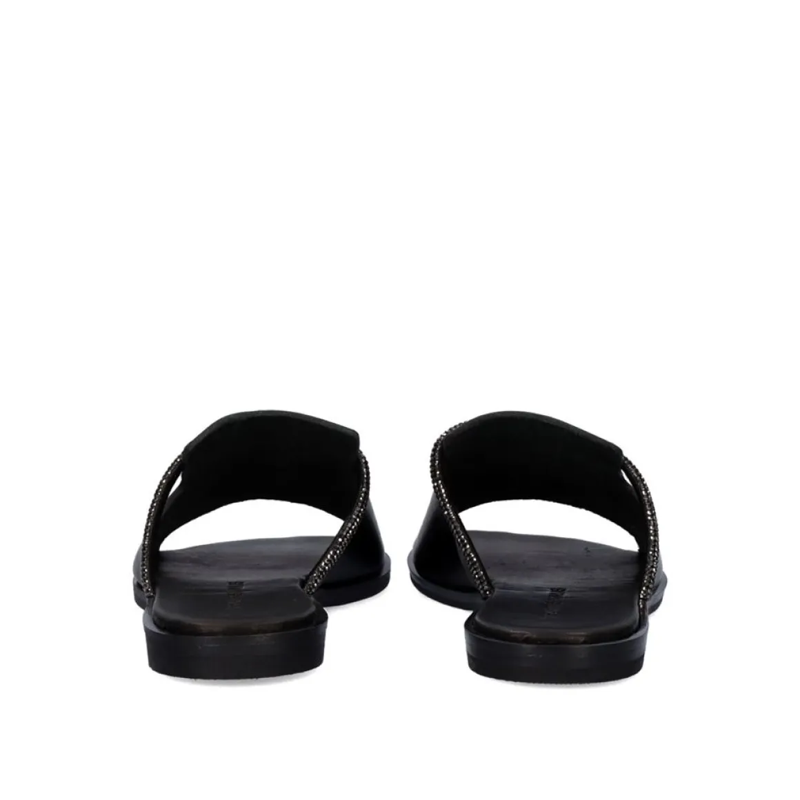 Sandalia Plana Na Cor Preto. Seu Corte E Palmilha Sao Feitos De Couro, A Sola E Feita De Material Sintetico. Apresenta Uma Faixa Decorativa Cheia De Brilhantes.