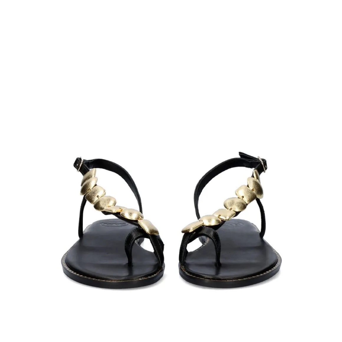 Sandalia De Couro Plana Fechada No Calcanhar Com Uma Fivela E Ornamentos Na Parte De Dentro.