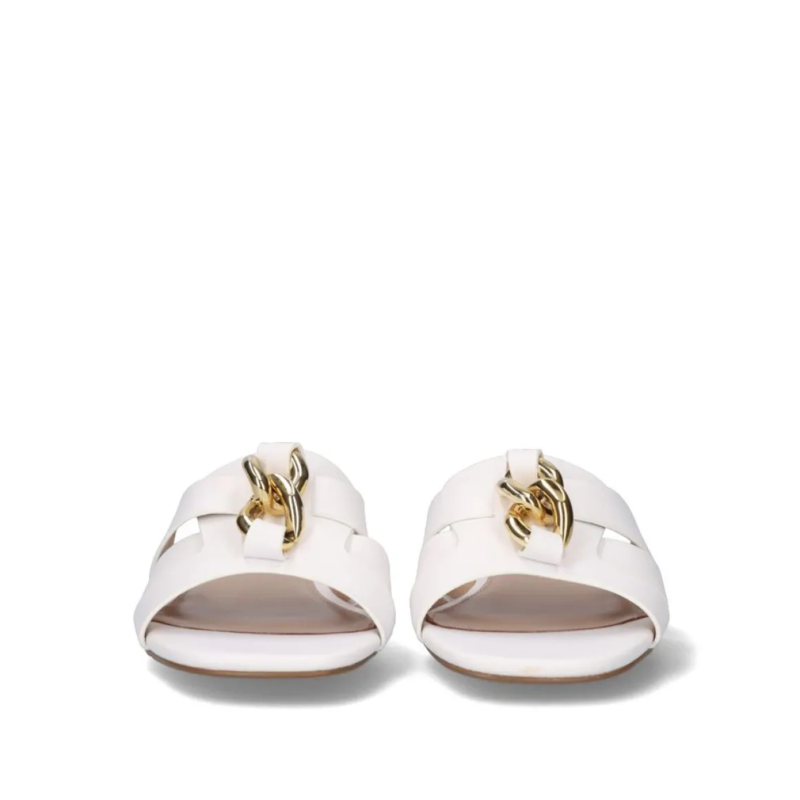Sandalia Plana Undercut Em Branco. Seu Corte E Sola Sao Feitos De Material Sintetico, A Palmilha E De Couro. Tem Um Ornamento Em Forma De Corrente No Peito Do Pe E Um Metalico No Calcanhar.