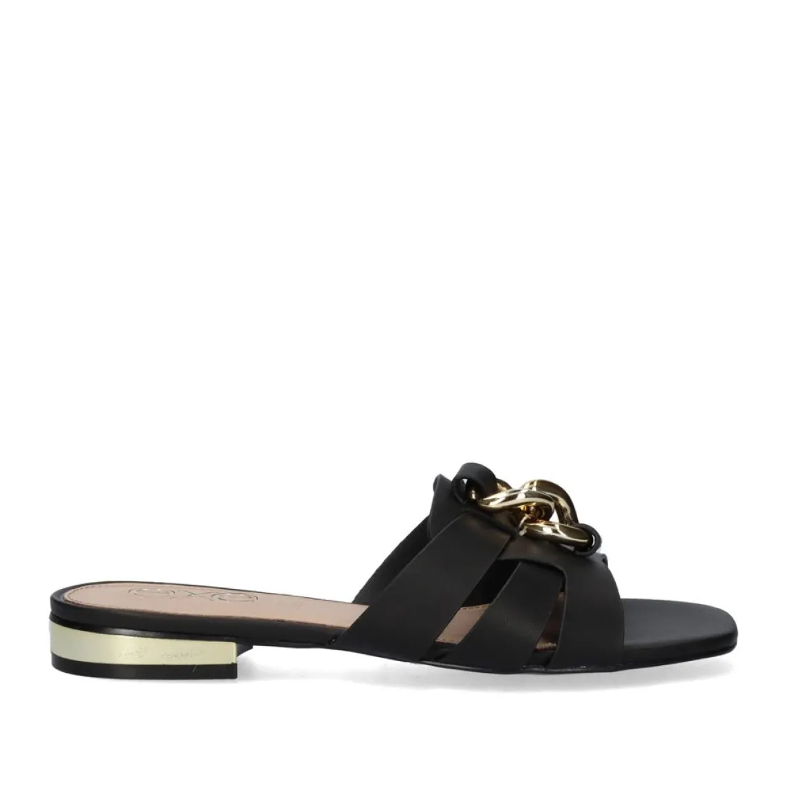 Sandalia Plana Undercut Em Preto. Seu Corte E Sola Sao Feitos De Material Sintetico, A Palmilha E De Couro. Tem Um Ornamento Em Forma De Corrente No Peito Do Pe E Um Metalico No Calcanhar.