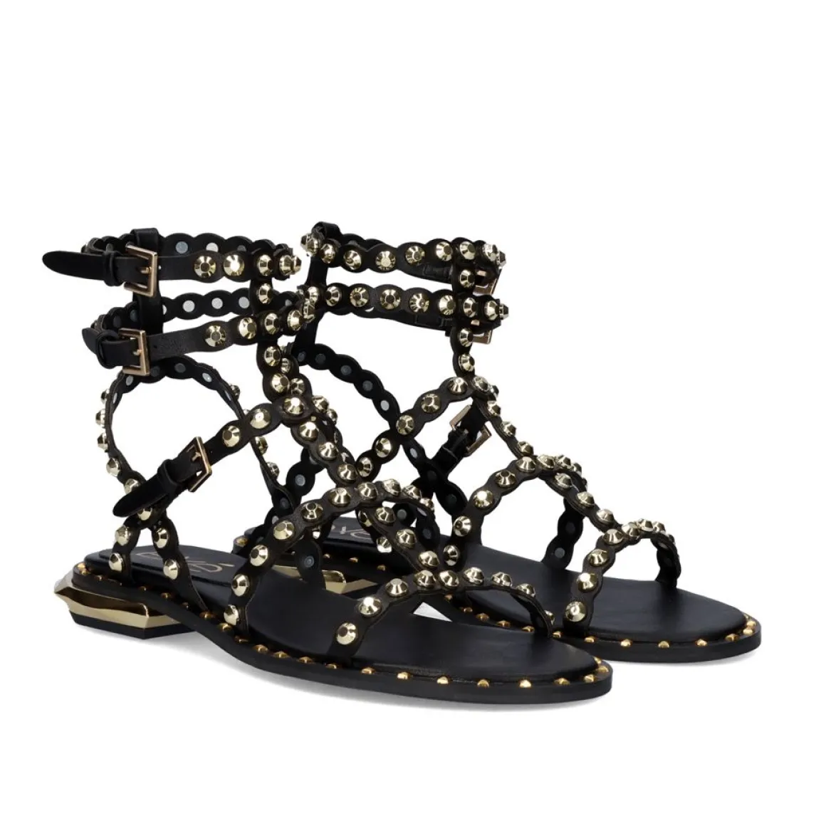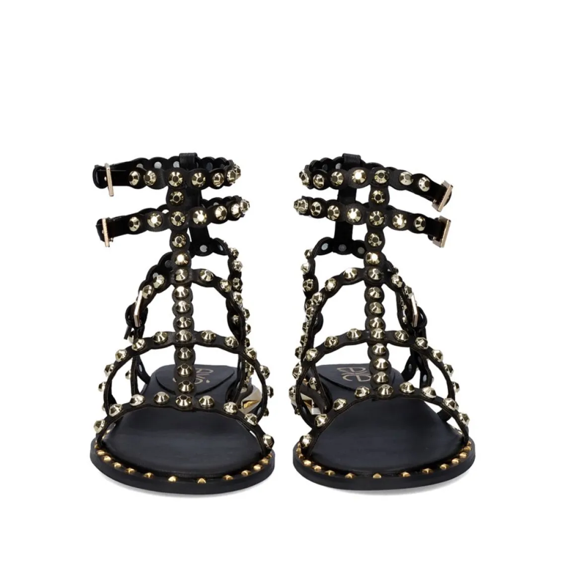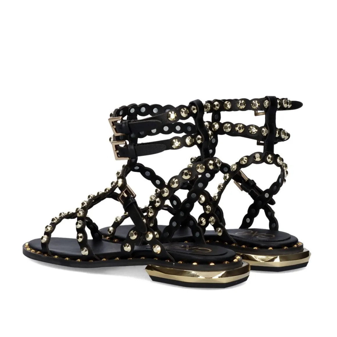 Sandalia Estilo Romano Em Preto.Seu Corte, Sola E Palmilha Sao Feitos De Material Sintetico. Tem Fechamento De Fivela Em Suas Tres Tiras E Tachas Douradas Como Ornamento. Alem Disso, Tem Um Detalhe Dourado No Calcanhar.