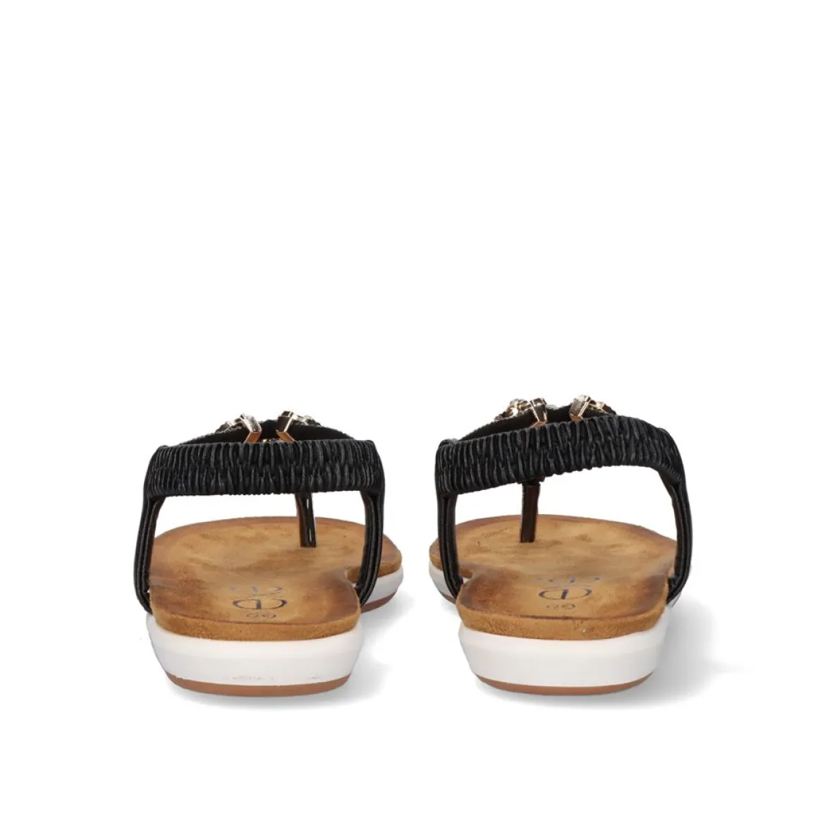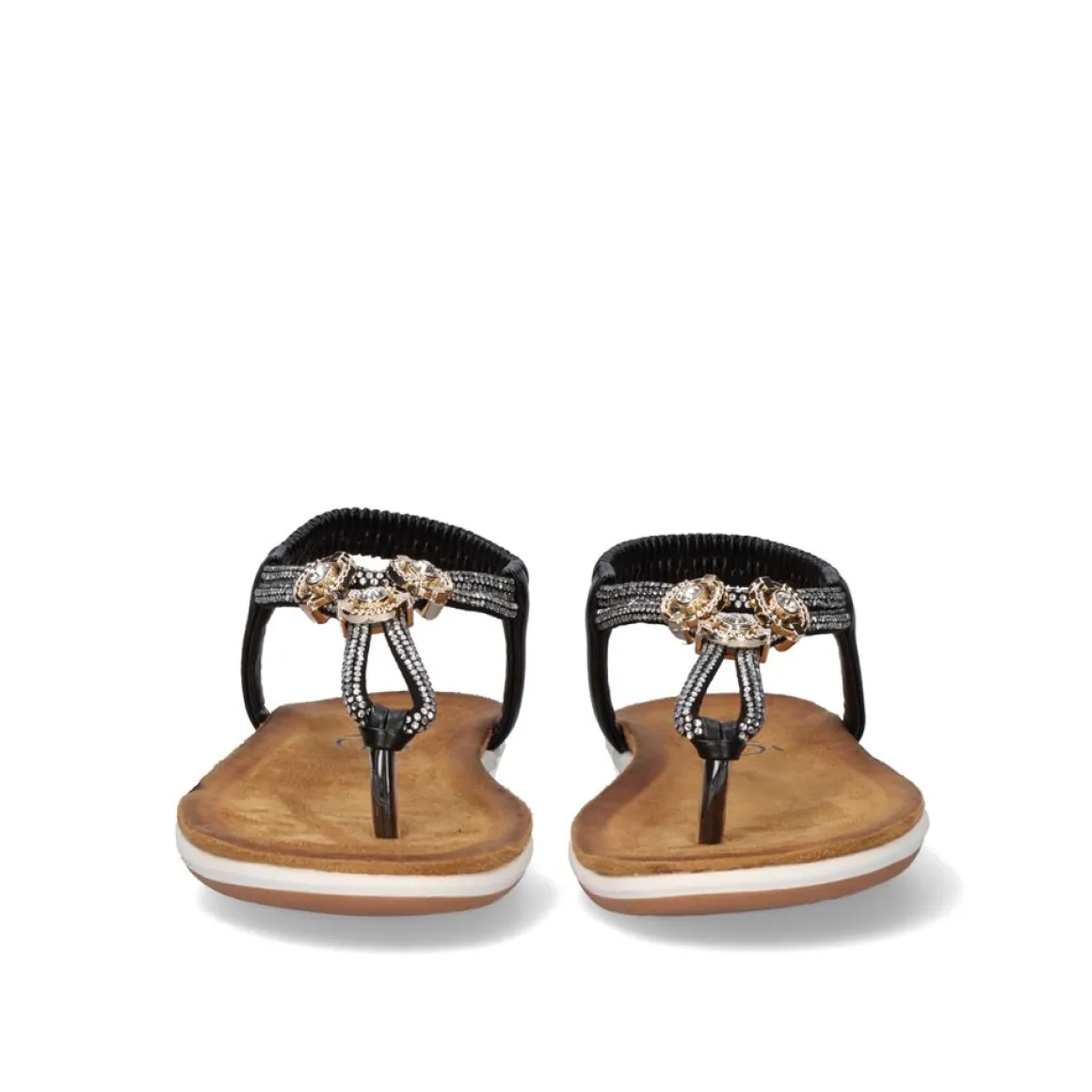 Sandalia Plana Em Preto. Seu Corte E Sola Sao Feitos De Material Sintetico, A Palmilha E Feita De Material Textil. Eles Tem Um Tornozelo Elastico Como Um Fechamento E Uma Combinacao De Ornamentos Brilhantes E Metalicos.