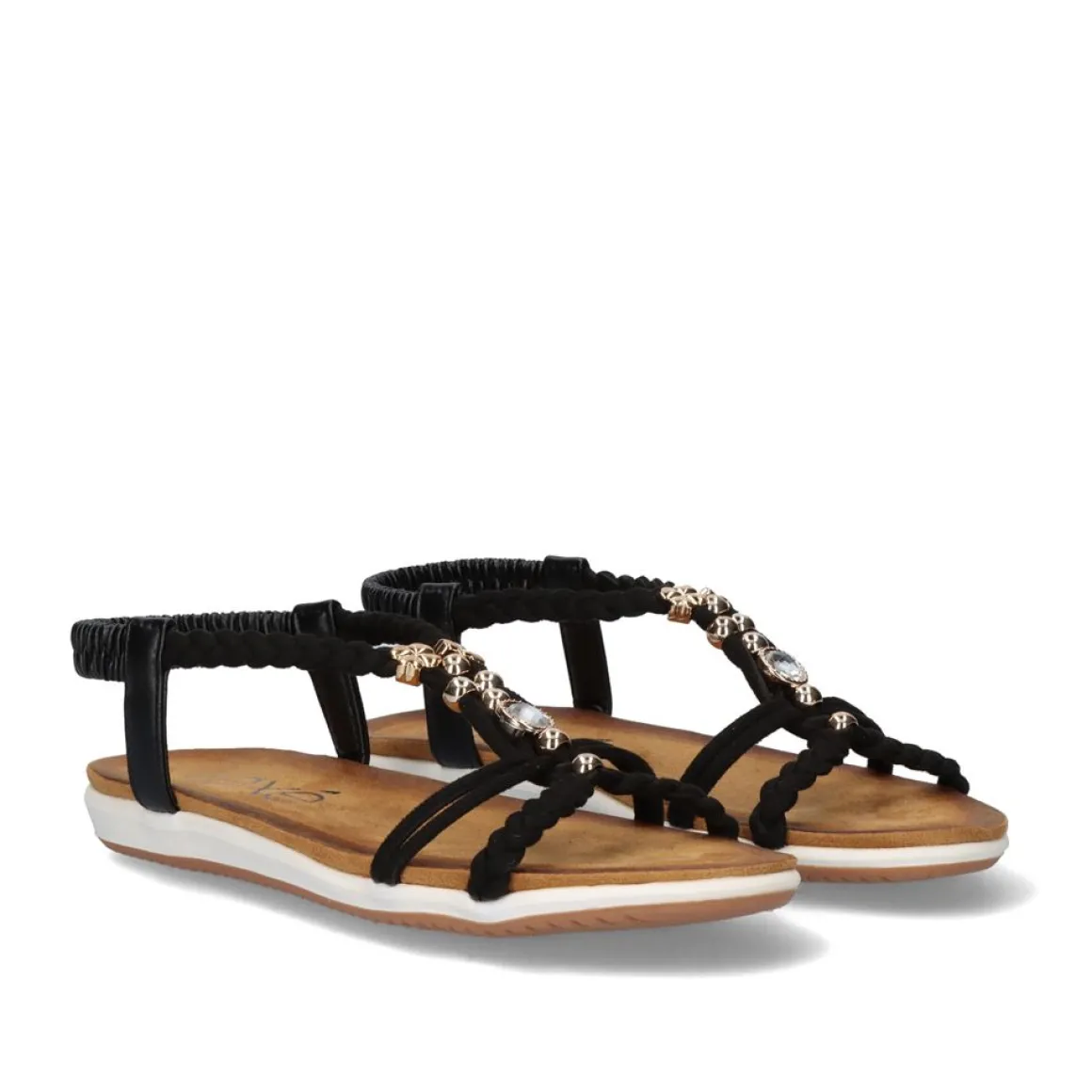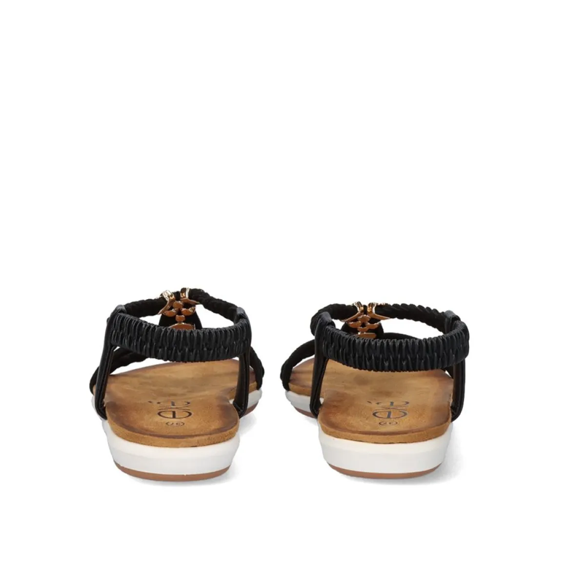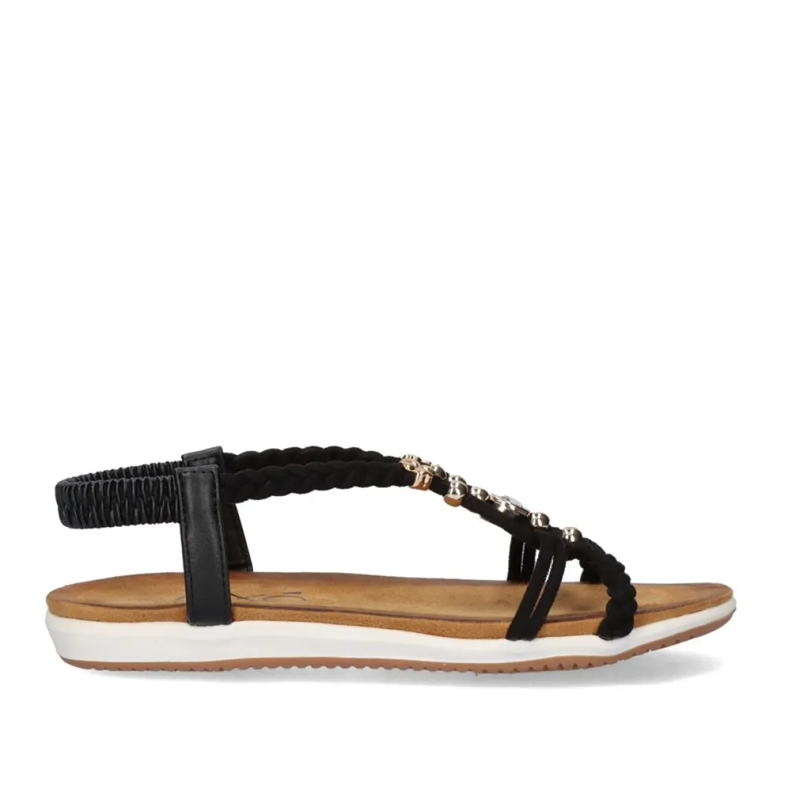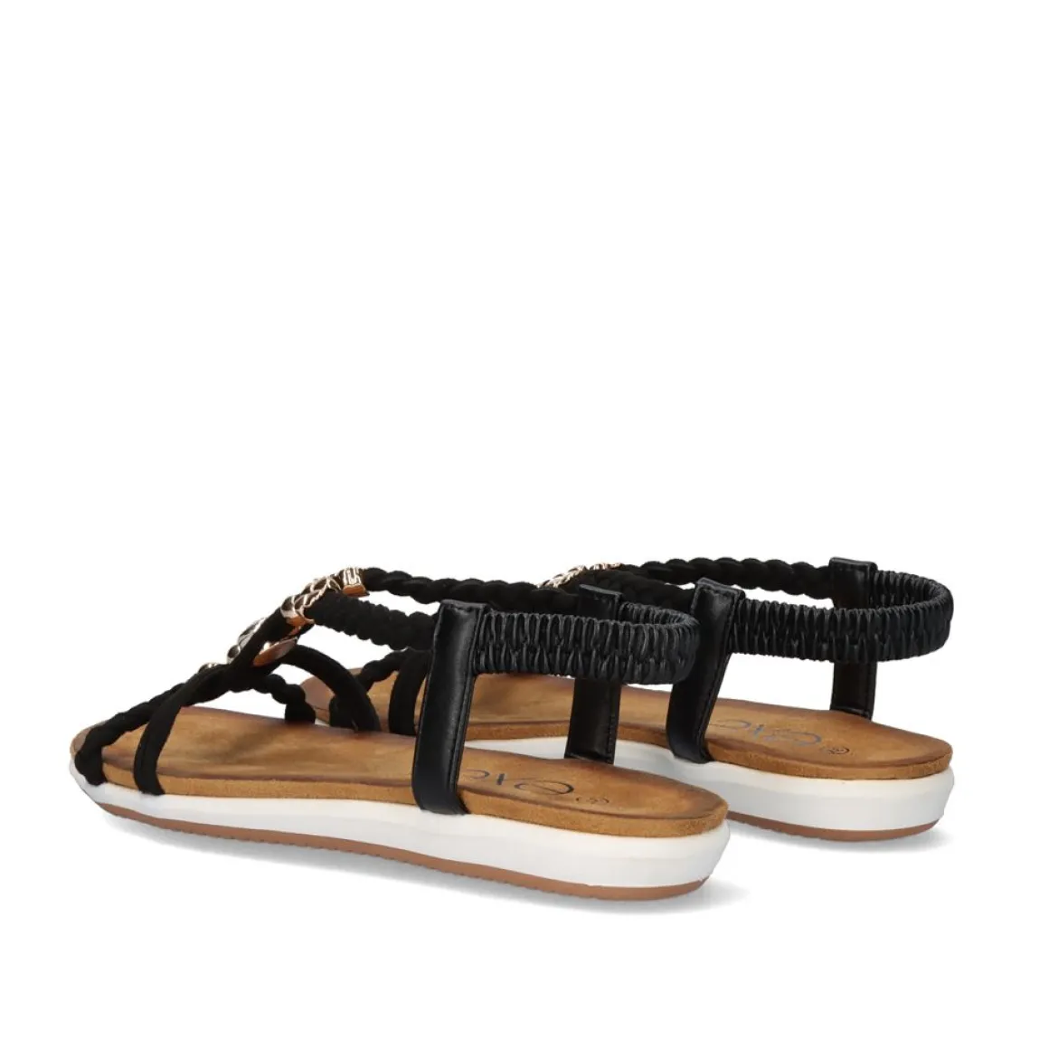 Sandalia Plana Em Preto. Seu Corte E Sola Sao Feitos De Material Sintetico, A Palmilha E Feita De Material Textil. Tem Um Elastico De Tornozelo Como Um Fecho E Ornamentos De Metal.