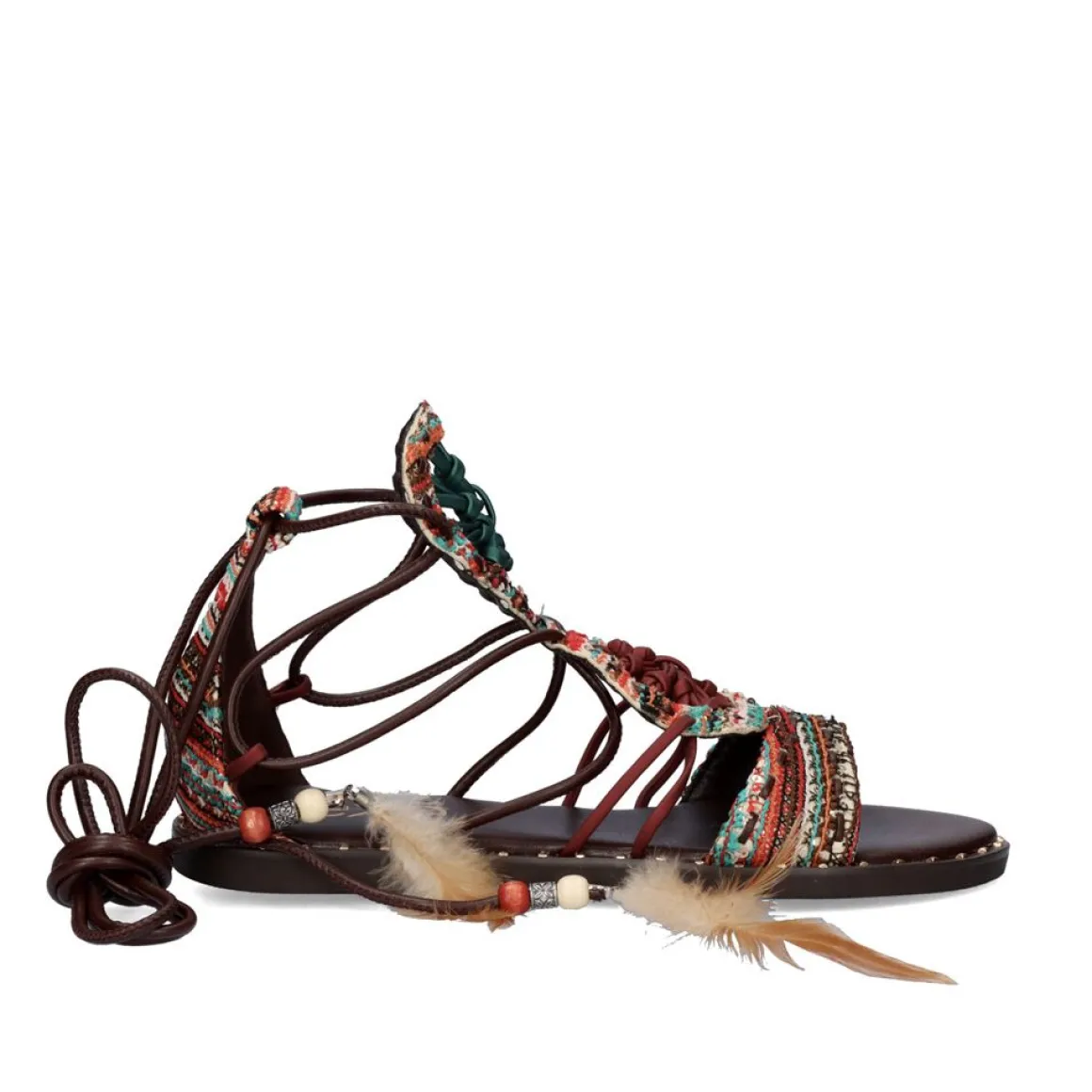 Sandalia Plana Fechada Ao Tornozelo Com Alcas Finas E Penas Em Suas Alcas. Sua Lamina E Feita De Material Sintetico E A Palmilha E Feita De Couro.