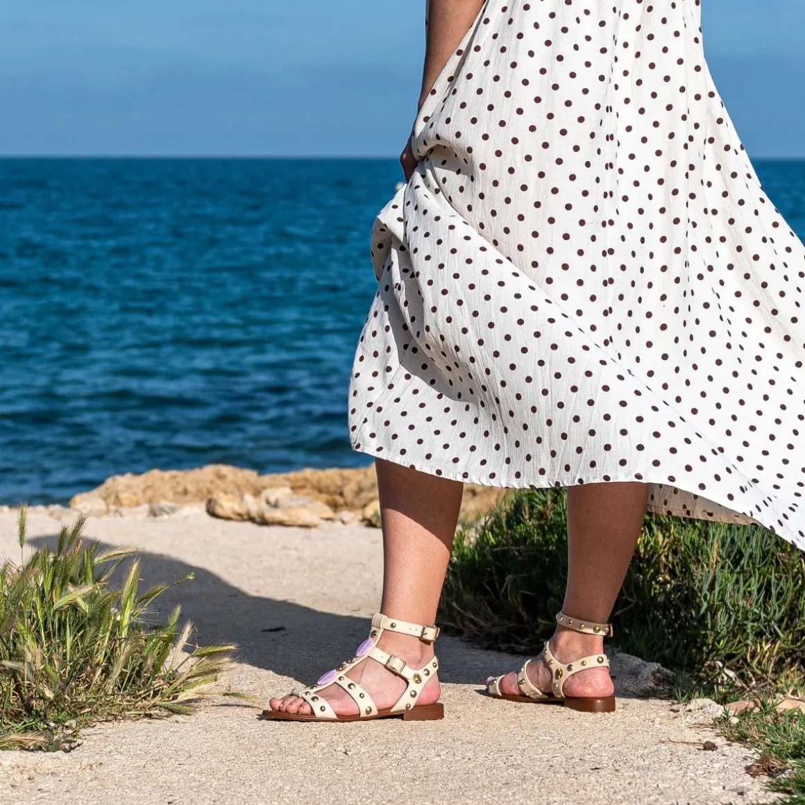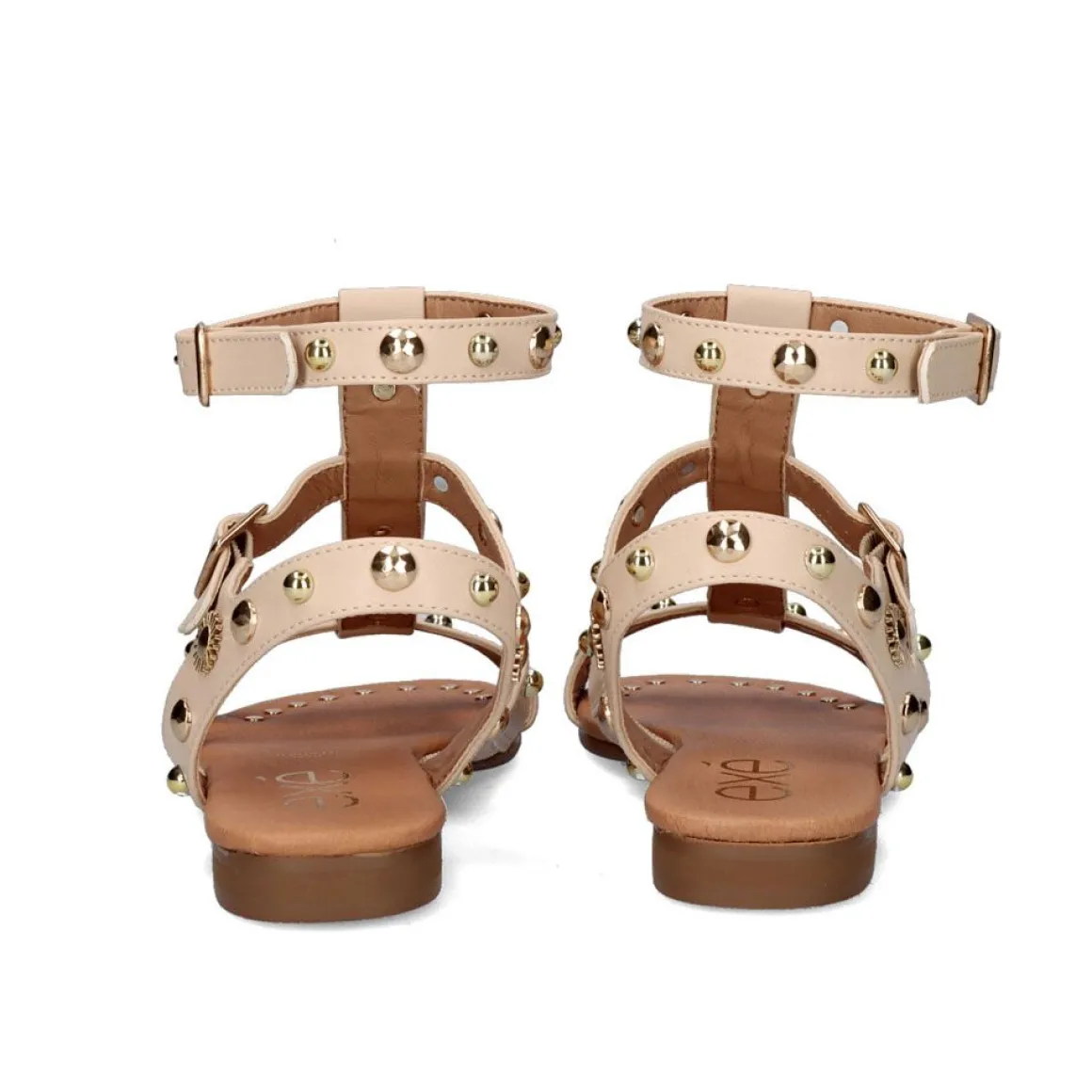 Sandalia Plana De Material Sintetico Com Estilo Escravo Com Fechamento No Tornozelo. Tem Ornamentos Dourados Para Todas As Suas Tiras E Plantas De Couro.