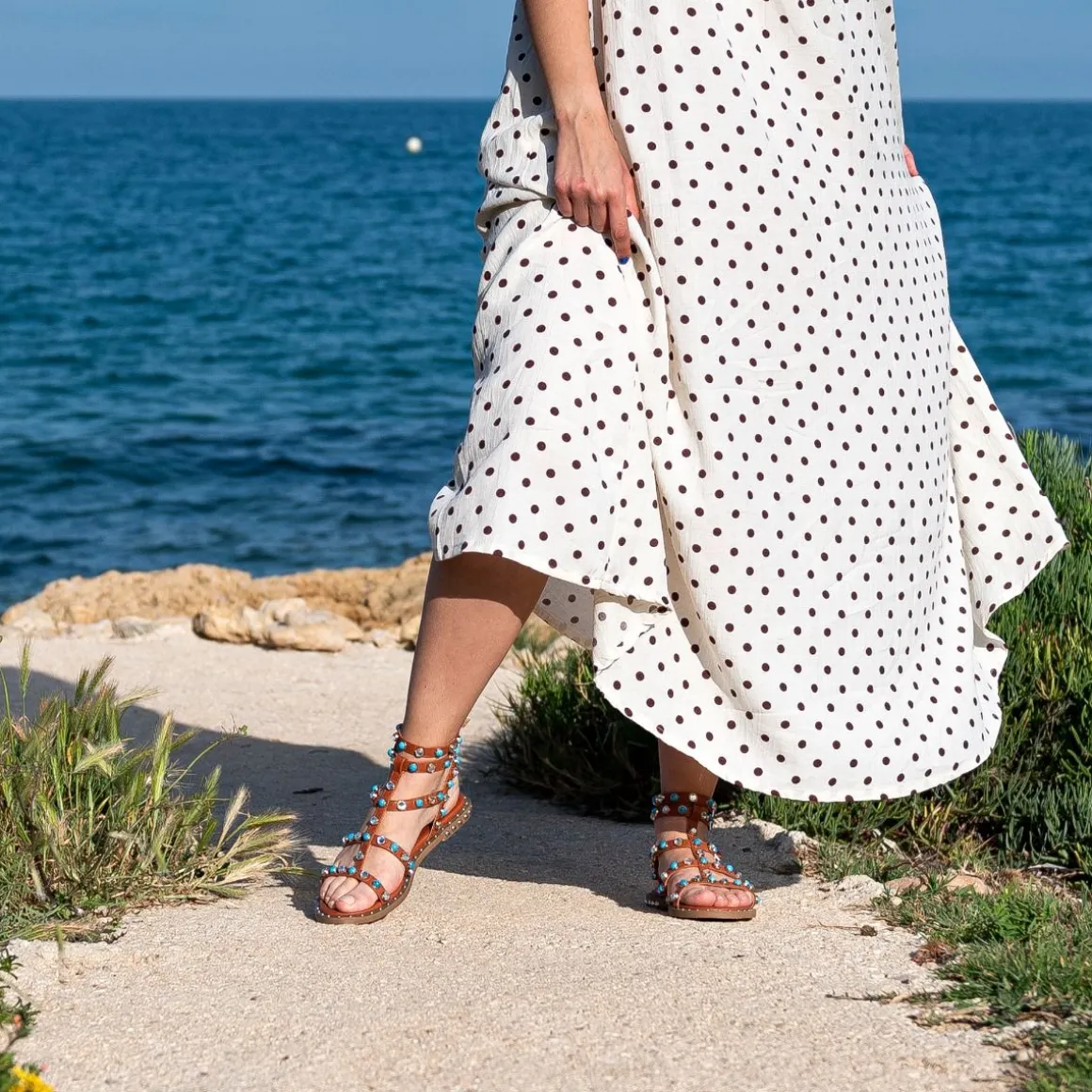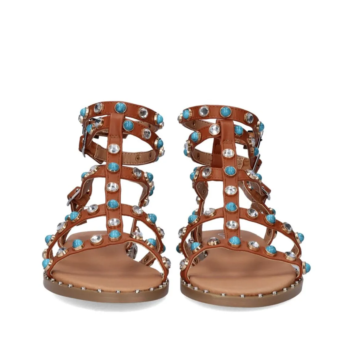 Sandalia Plana Feita De Material Sintetico. Estilo Escravo Com Fechamento Com Tres Fivelas No Tornozelo. Tem Ornamentos Na Forma De Circulos De Cristal E Em Cor Azul Para Todas As Suas Tiras. Alem Disso, Tem Rebites Prateados Na Planta De Couro.