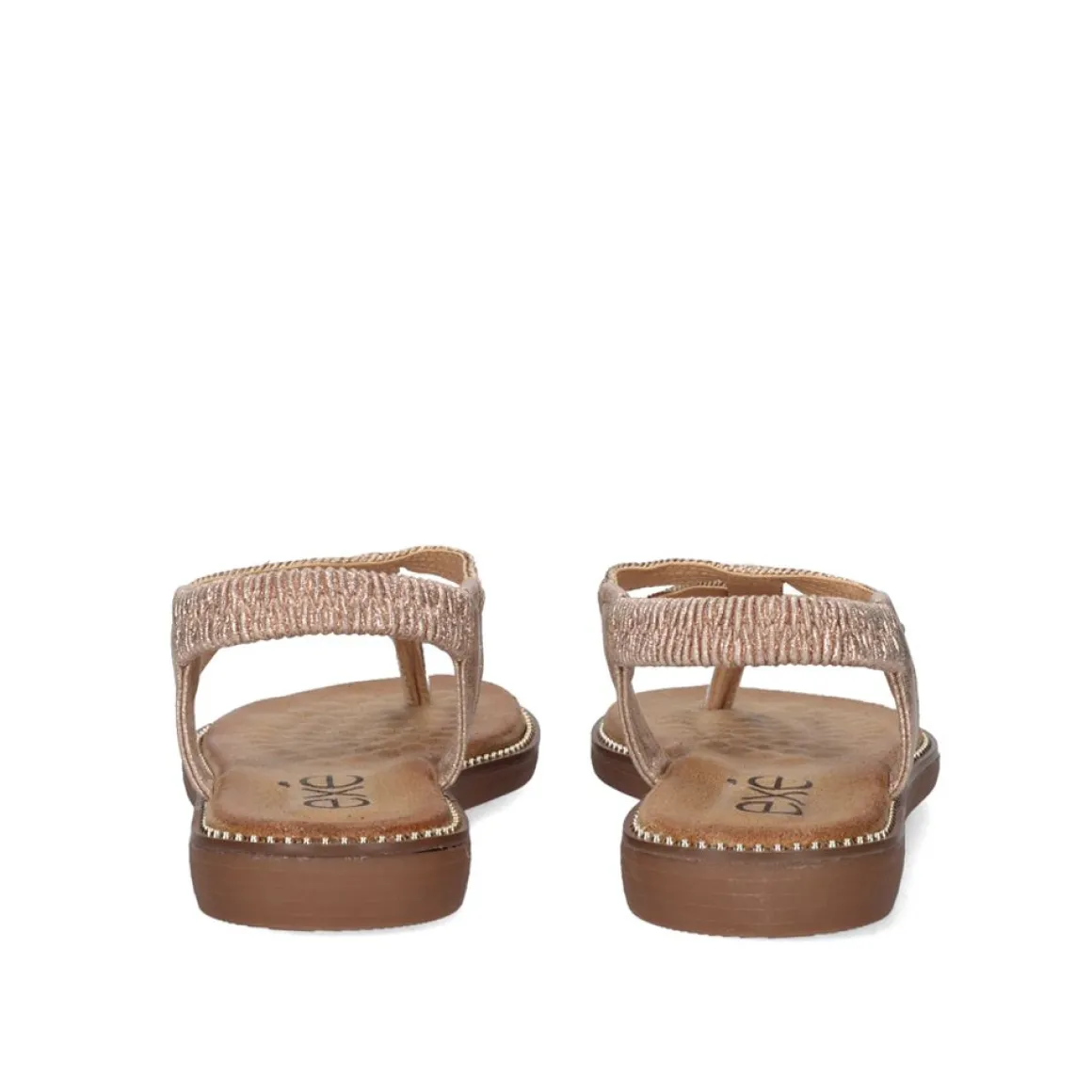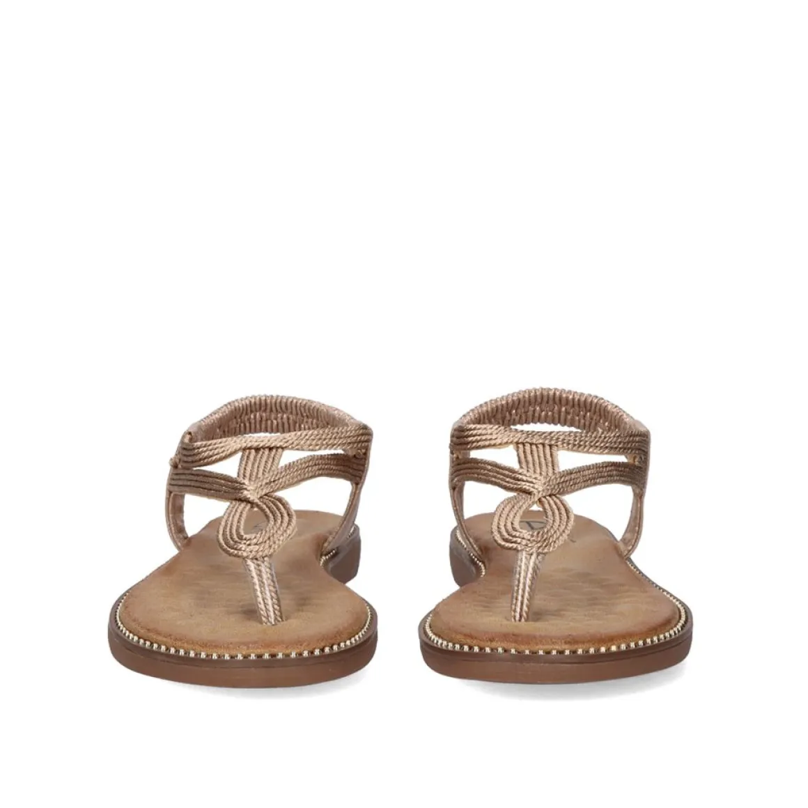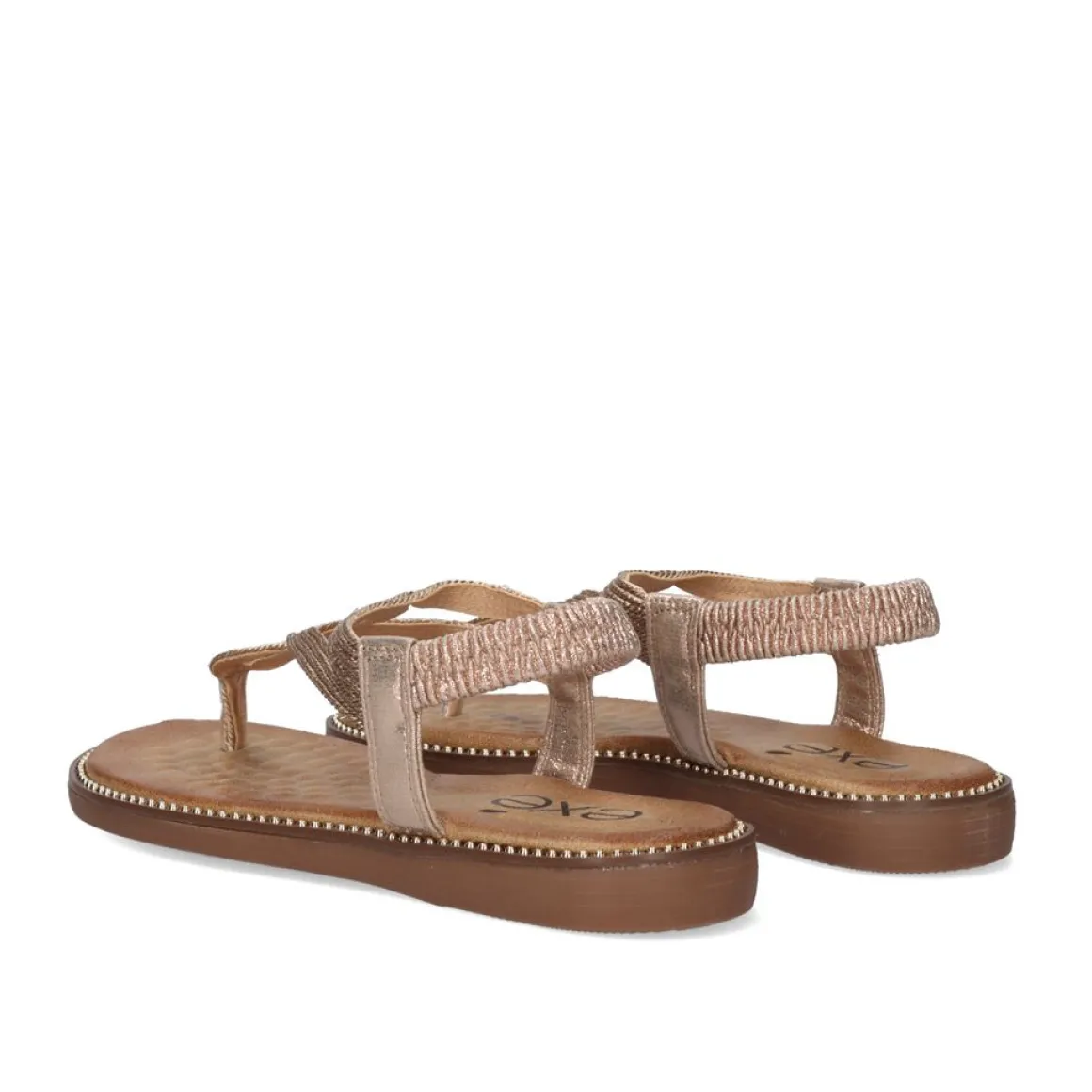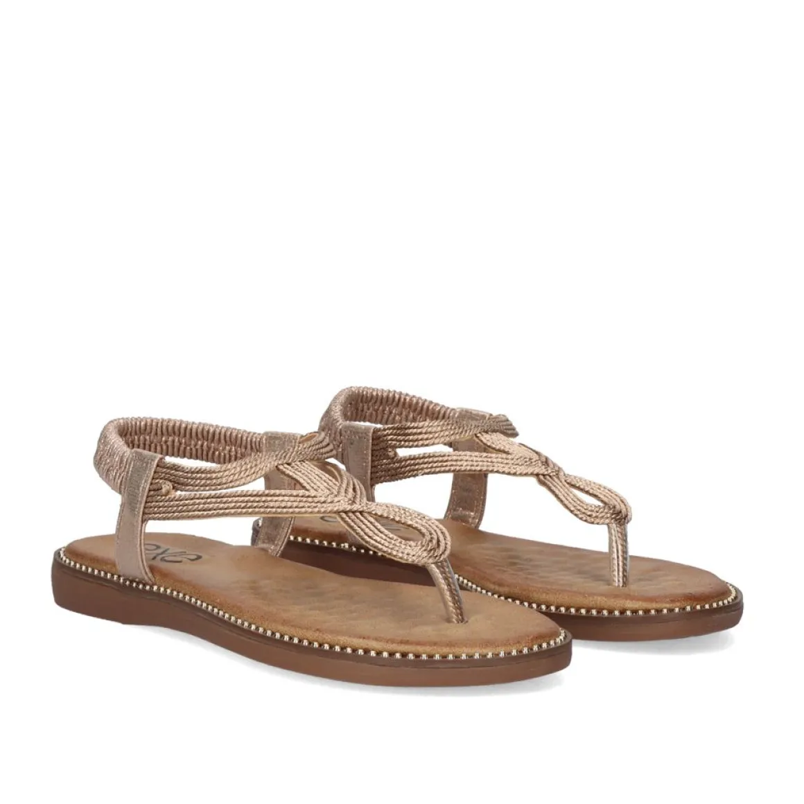 Sandalia Plana Em Rosa Ouro. Seu Corte E Textil, Palmilha E Sola Sao Feitas De Material Sintetico. E Segurado Ao Pe Por Uma Tira Elastica Na Parte De Tras Do Tornozelo.