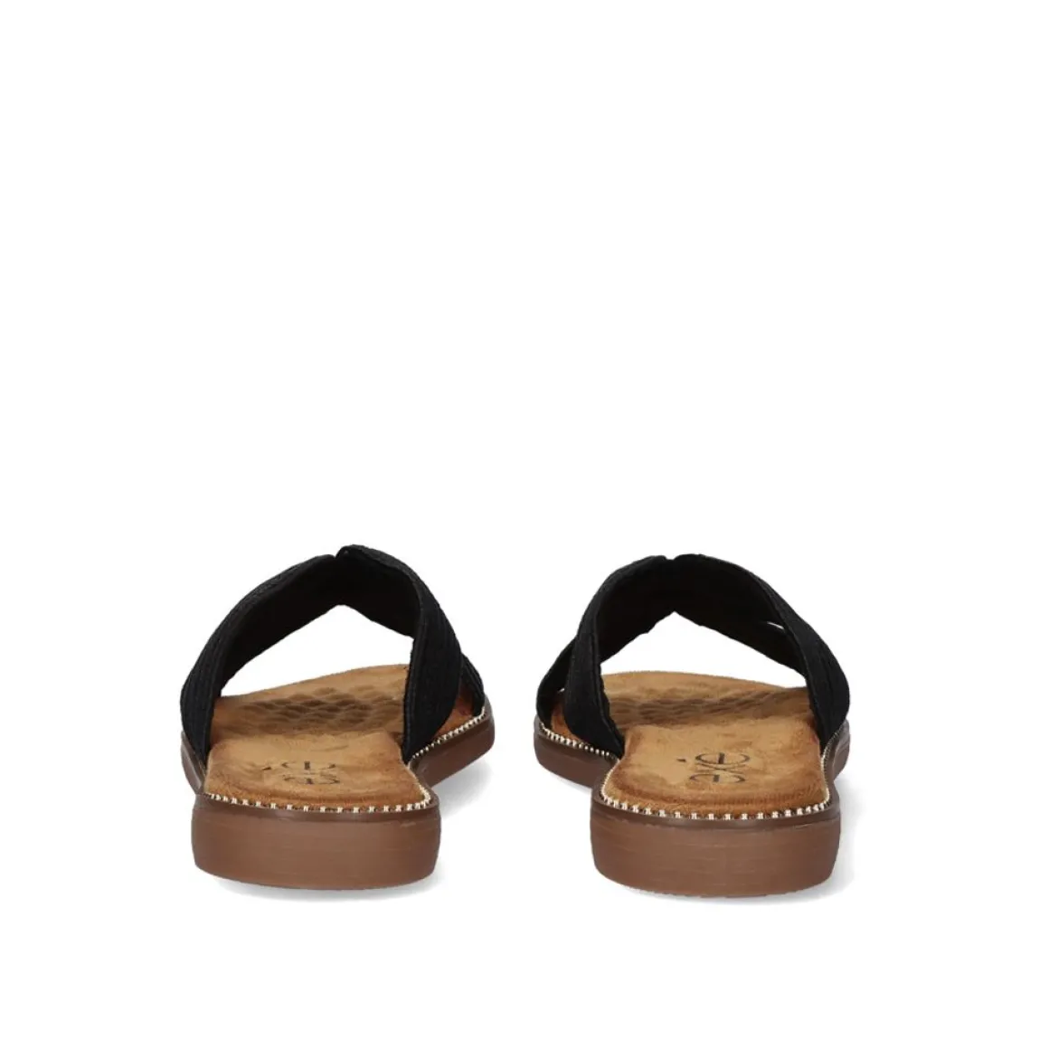 Sandalia Plana De Material Sintetico Presa Ao Pe Por Uma Larga Faixa Na Area Do Passo. Tem Pequenos Rebites Ao Redor Da Palmilha De Couro.