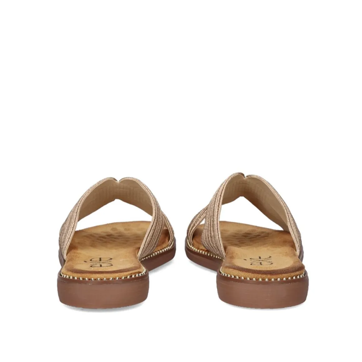 Sandalia Plana De Material Sintetico Presa Ao Pe Por Uma Larga Faixa Na Area Do Passo. Tem Pequenos Rebites Ao Redor Da Palmilha De Couro.