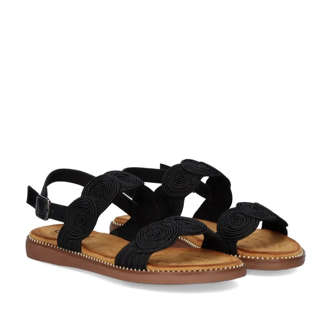 Sandalia Plana Feita De Material Sintetico E Palmilha De Couro. Sua Faixa Frontal E A Do Inicio Carregam Um Material Que Faz Formas Circulares Sobre Eles. Ele E Pego No Tornozelo Por Outra Tira Fina E Uma Fivela.