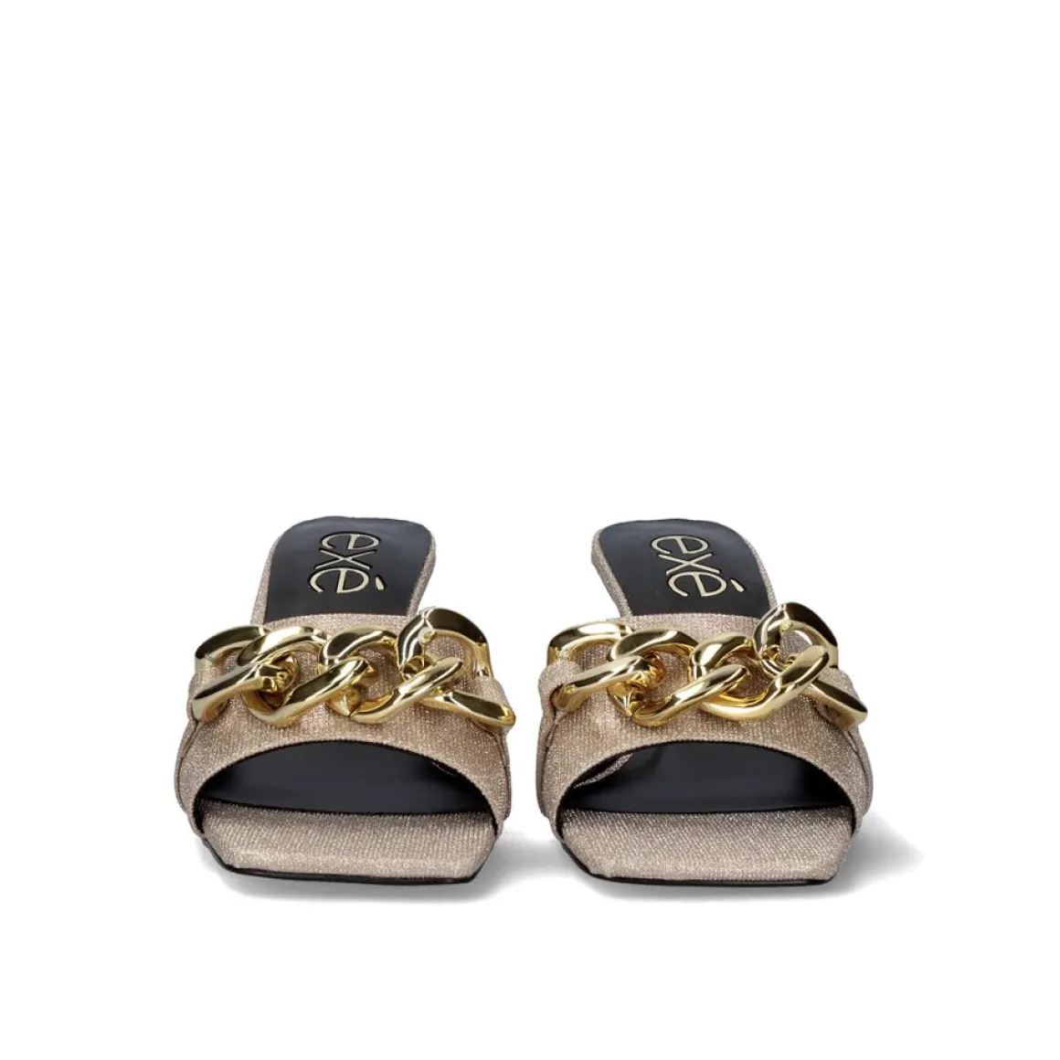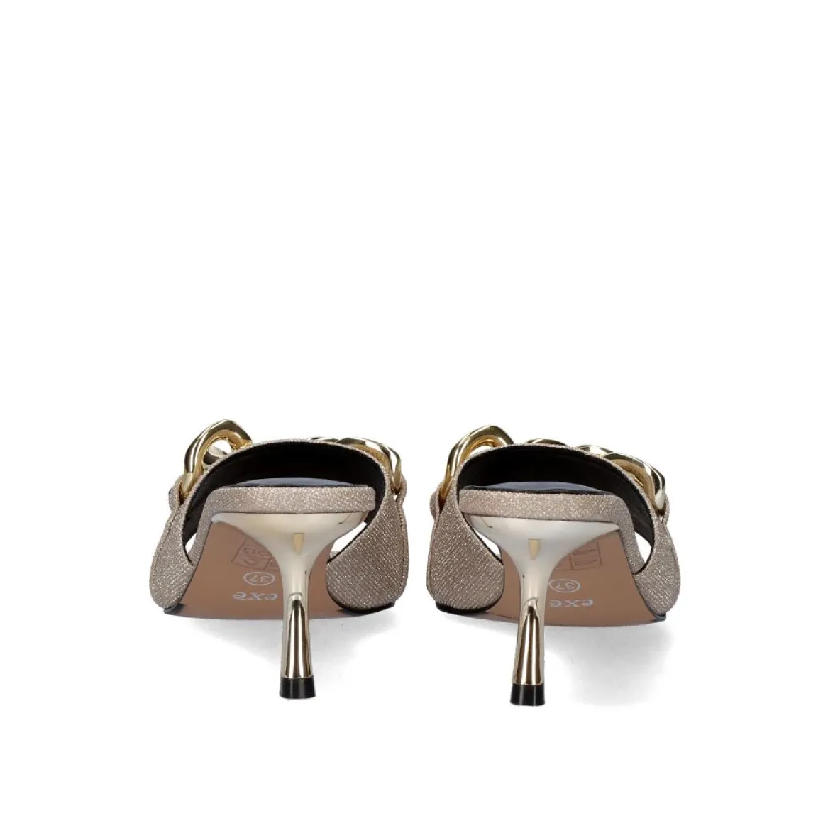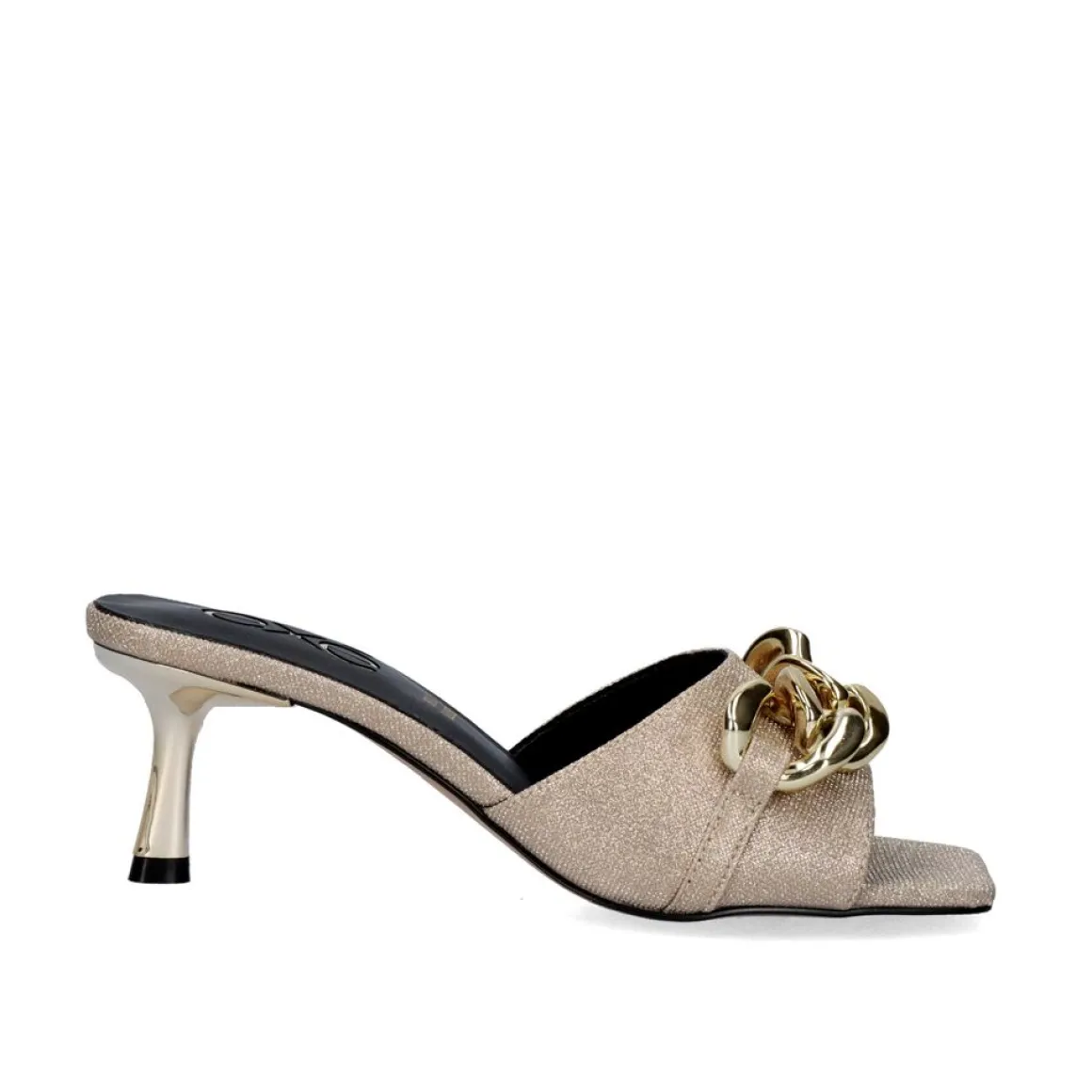 Sandalia Detalonada Com Salto Baixo De 6 Cm E Palmilha De Couro. A Pa E Brilhante Com Ornamento Em Forma De Corrente.