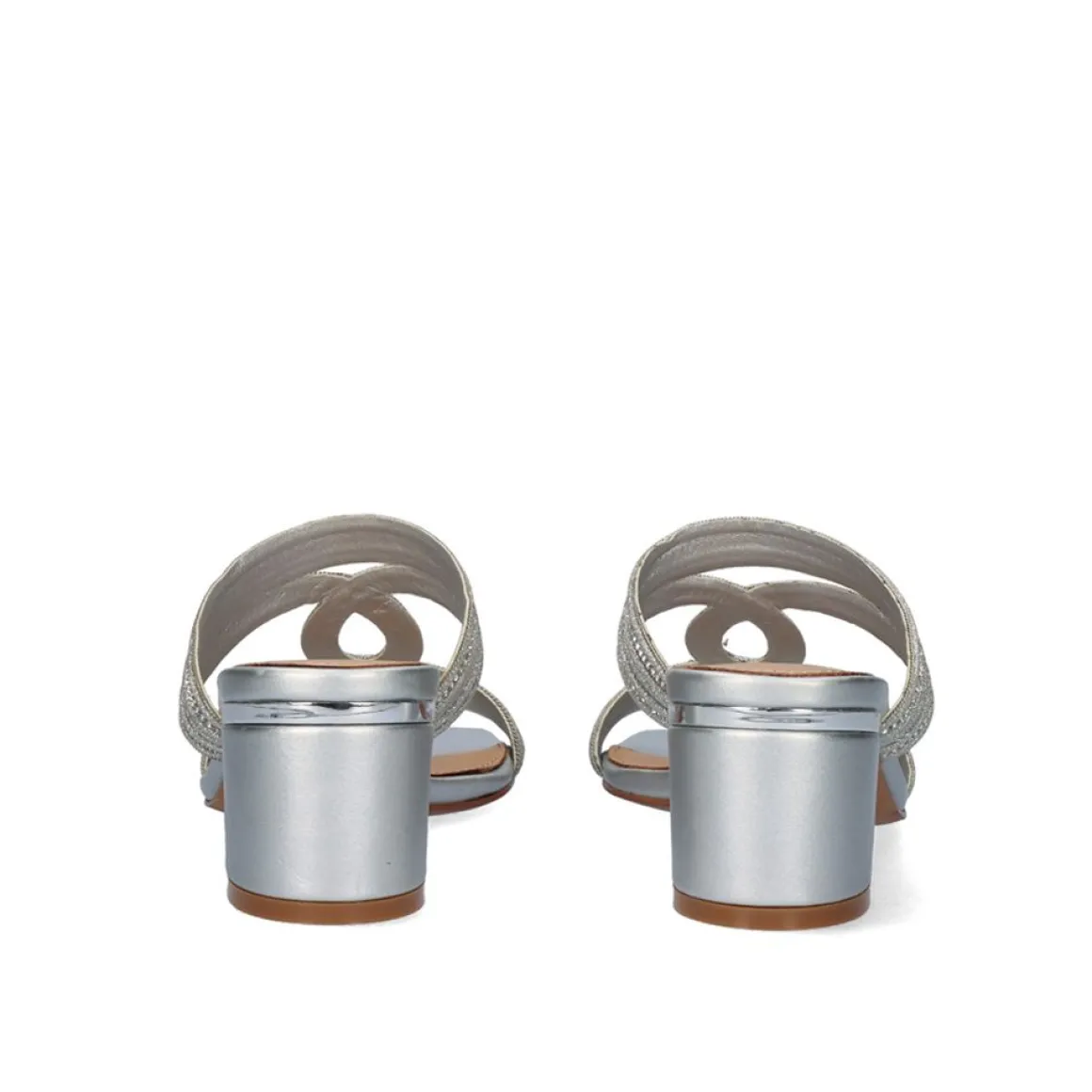 Sandalia De Salto Baixo Com Um Detalhe Metalico. A Lamina E Feita De Material Sintetico Na Forma De Tiras Com Glitters Que Se Cruzam Entre Si. A Altura Do Calcanhar E De 5 Cm E Sua Palmilha E Feita De Couro.