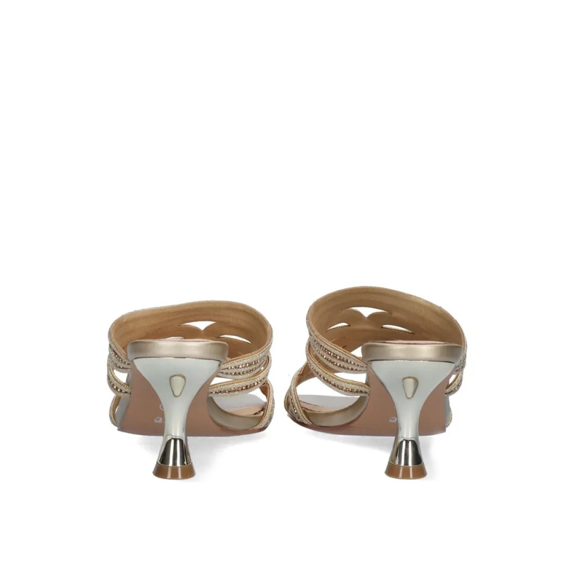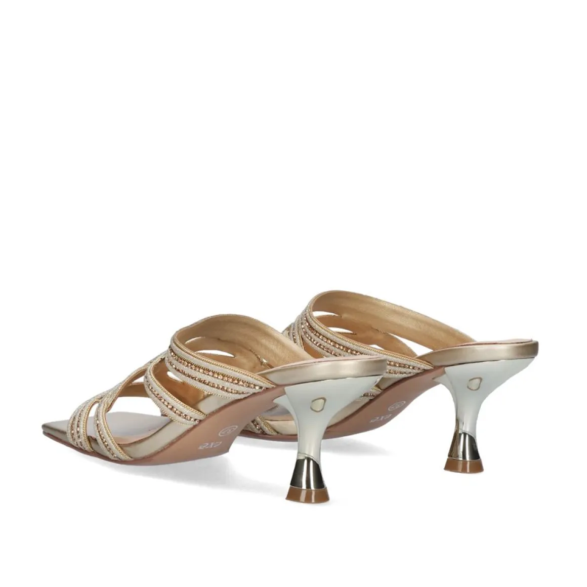 Sandalia Com Salto Baixo E Metalico. Sua Lamina E Feita De Material Sintetico Na Forma De Tiras Finas Que Fazem Diferentes Formas. A Altura Do Calcanhar E De 6 Cm E Sua Palmilha E Feita De Couro.