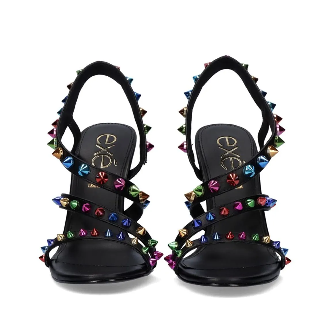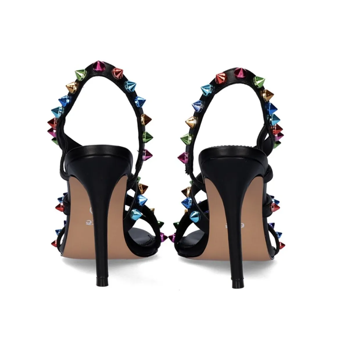 Sandalia De Salto De 10 Cm Em Preto Com Tachas Coloridas. Seu Corte E Sola Sao Feitos De Material Sintetico, A Palmilha E Feita De Couro.