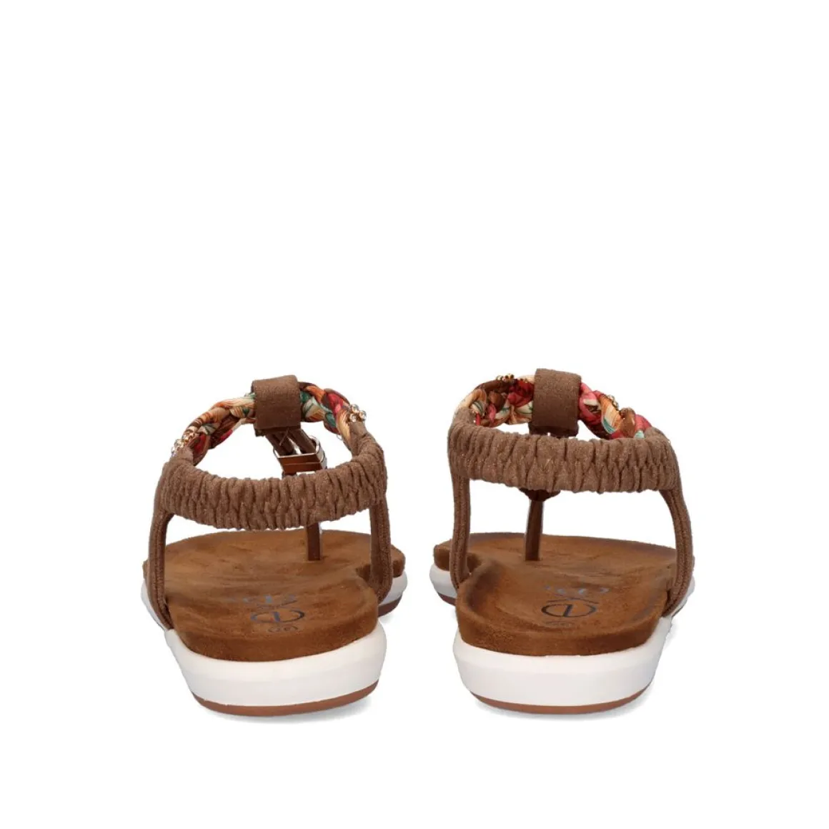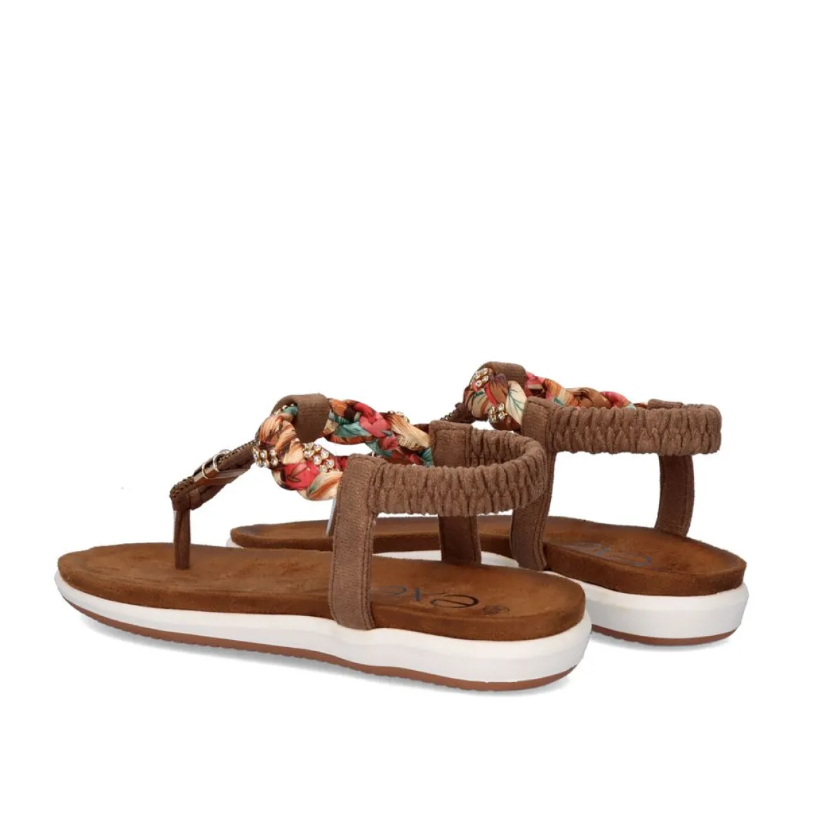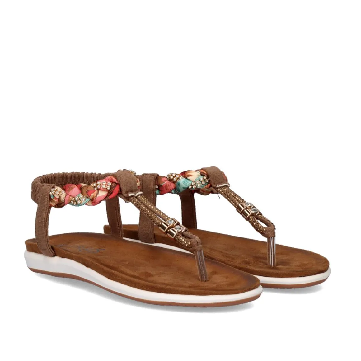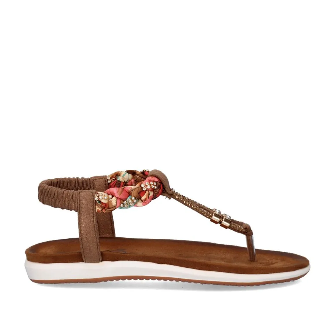 Sandalia Rasa De Biqueira Sintetica Em Castanho Com Pormenores Brilhantes Ao Longo Da Biqueira E Pormenores Em Tecido Entrancado.