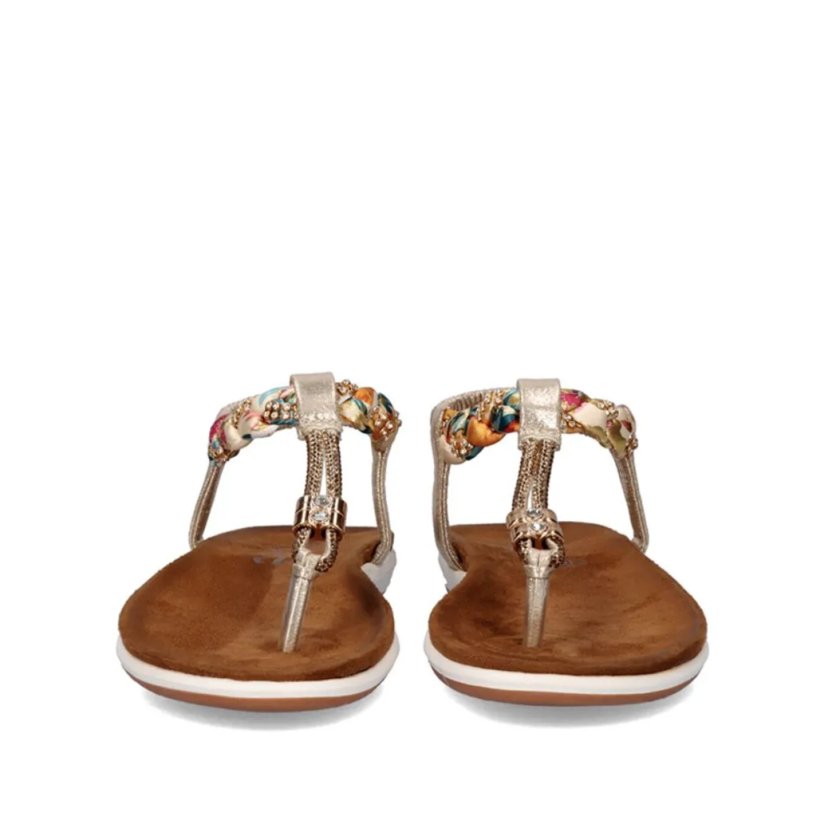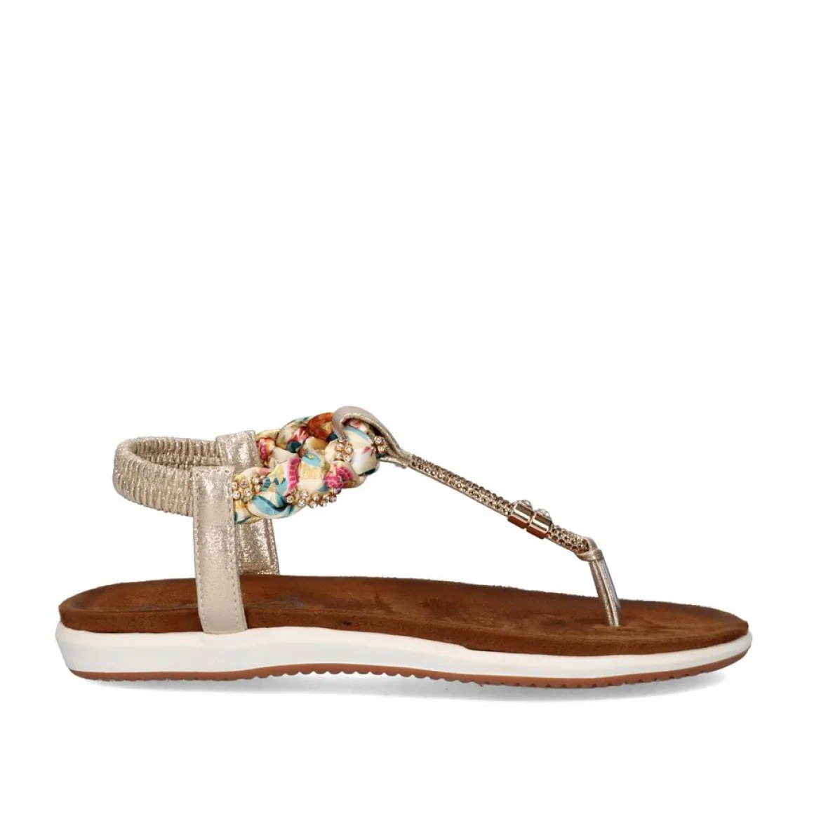 Sandalia Rasa De Bico Sintetico Em Dourado Com Detalhes Brilhantes Em Toda A Tira Do Bico E Detalhes Em Tecido Trancado.