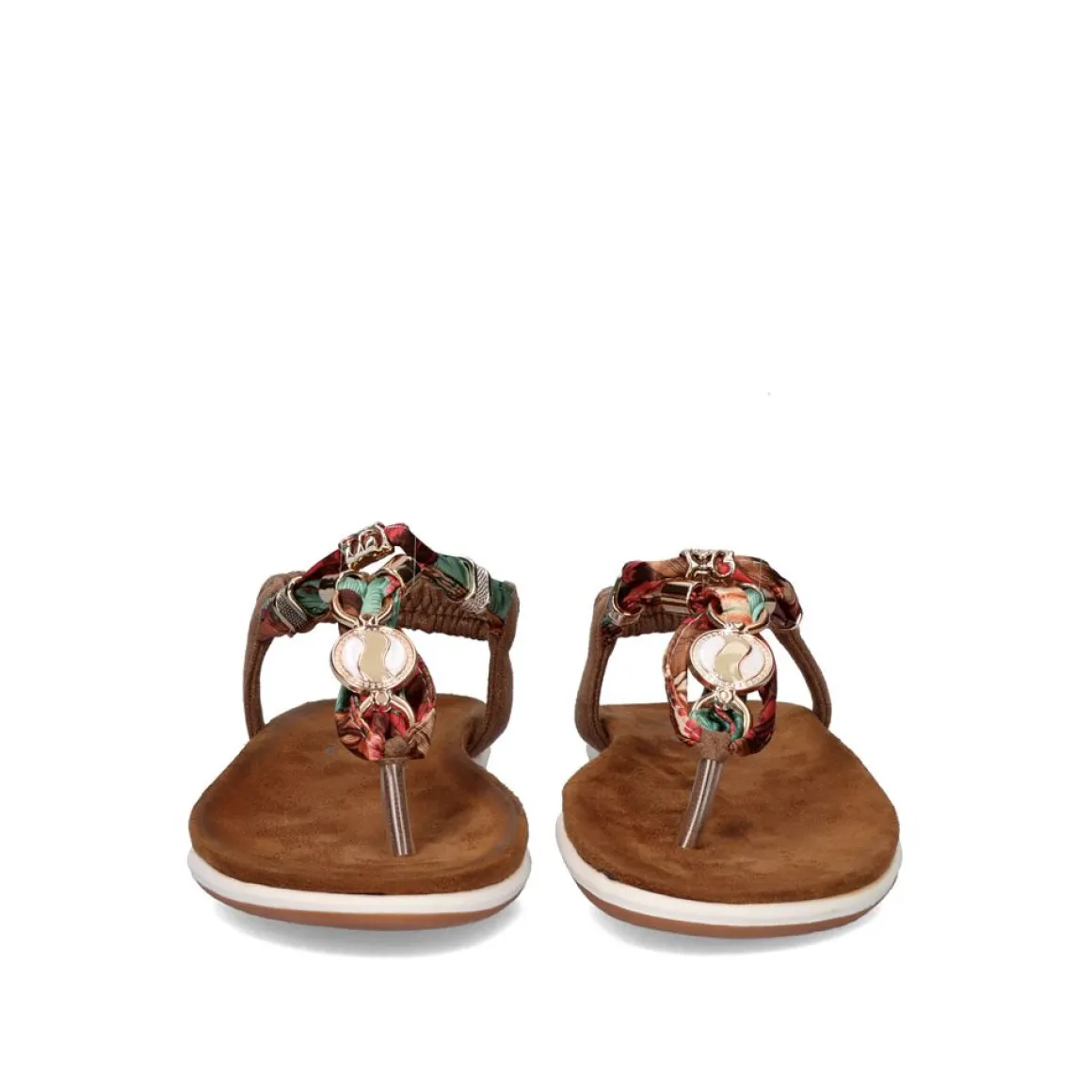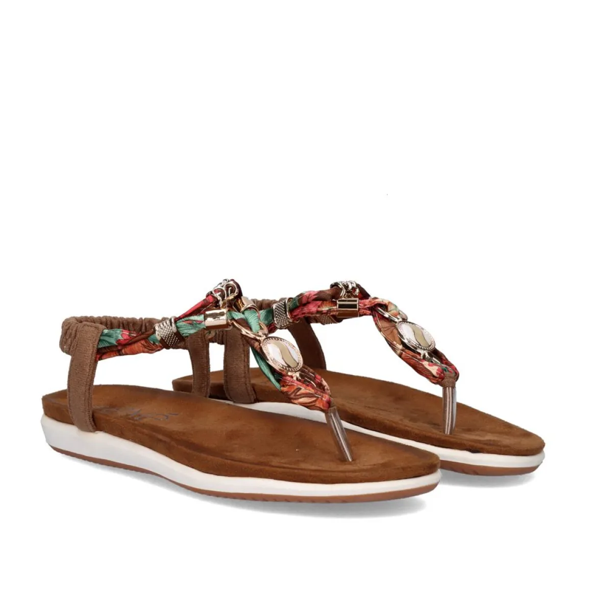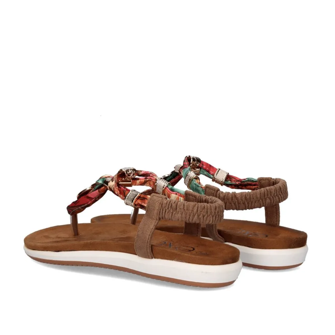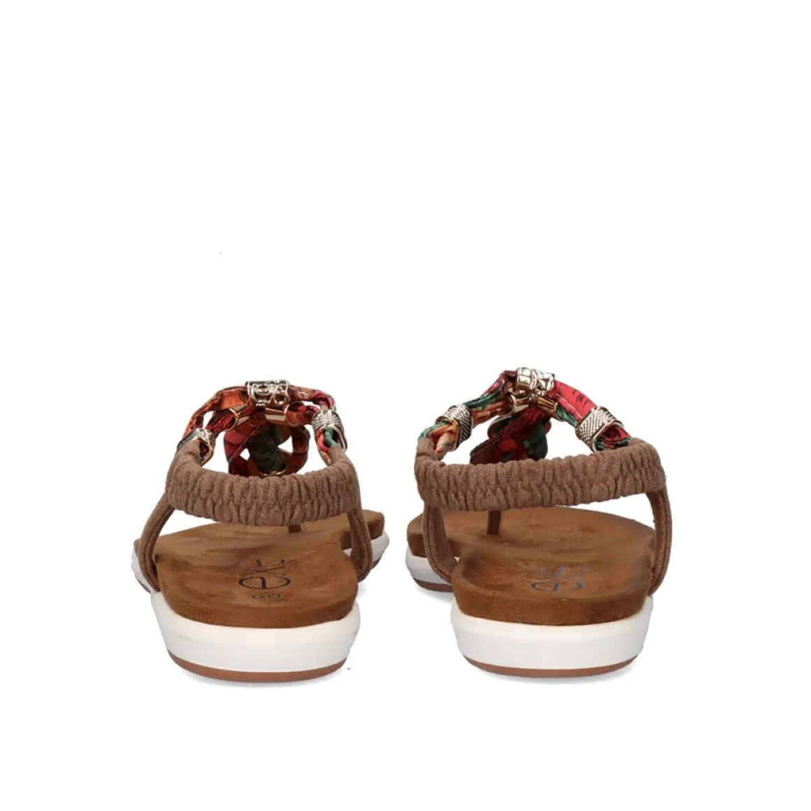 Sandalia Rasteira De Bico Sintetico Na Cor Marrom Com Detalhes Coloridos Nas Tiras.