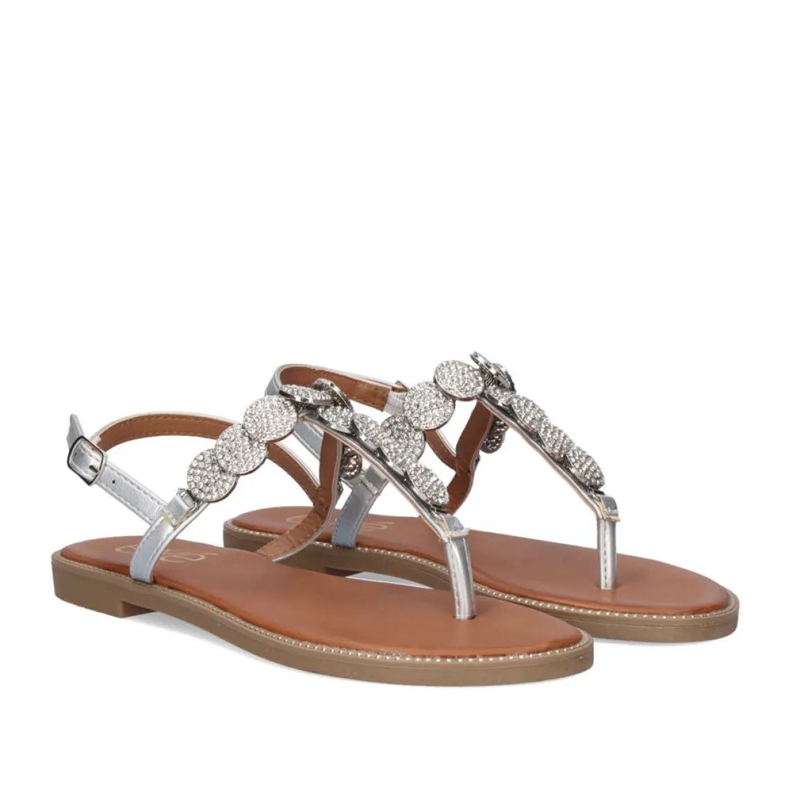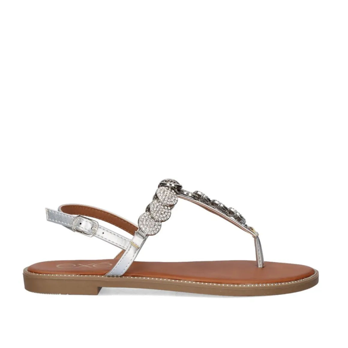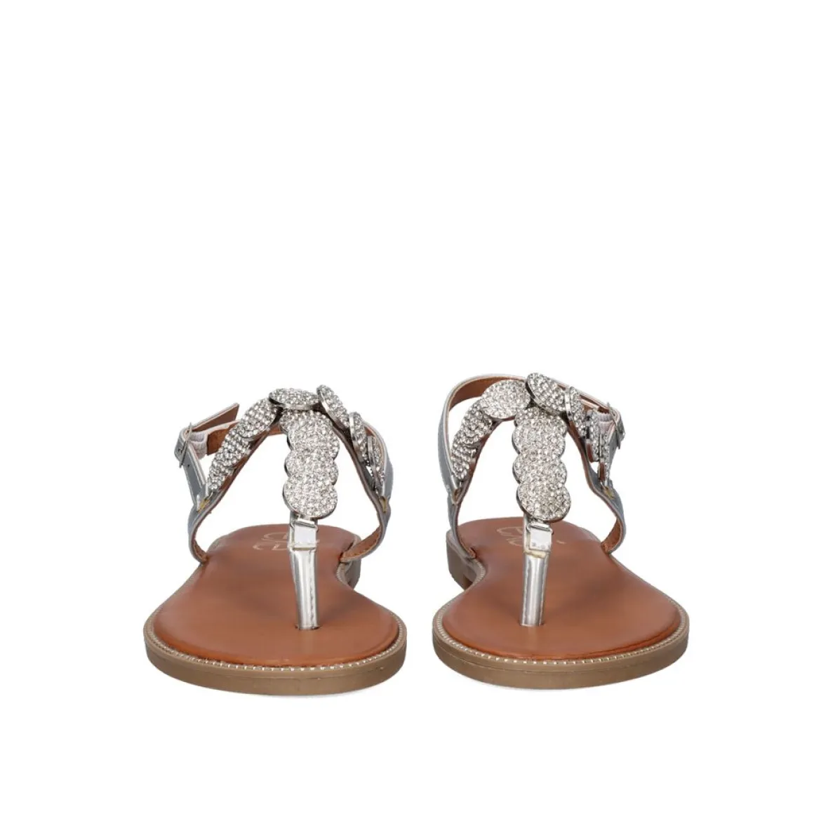 Sandalia Rasa De Bico Prateado Com Detalhes Brilhantes Na Tira Frontal E Fechamento Por Tira Amarrada No Tornozelo. Sandalia Confeccionada Em Material Sintetico.