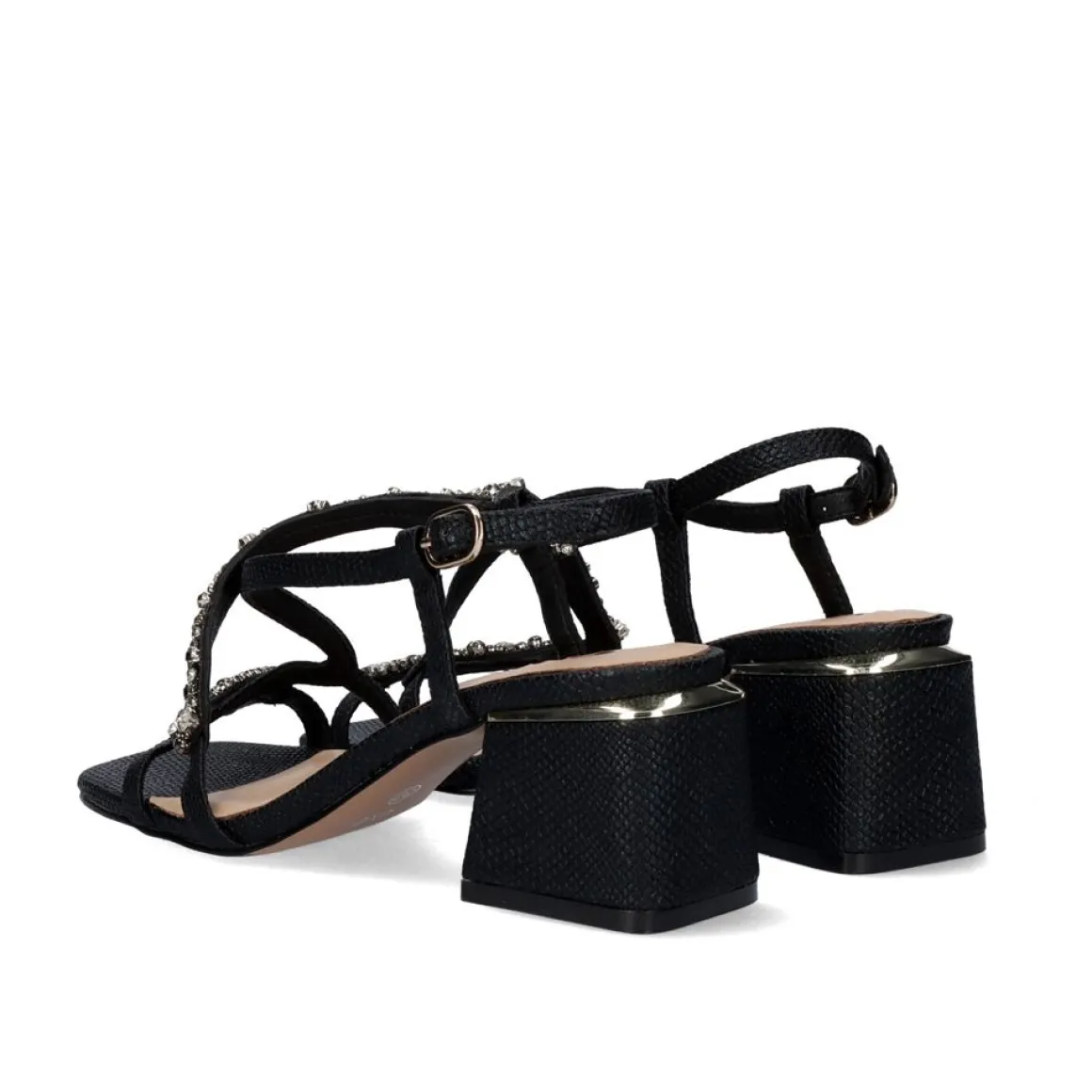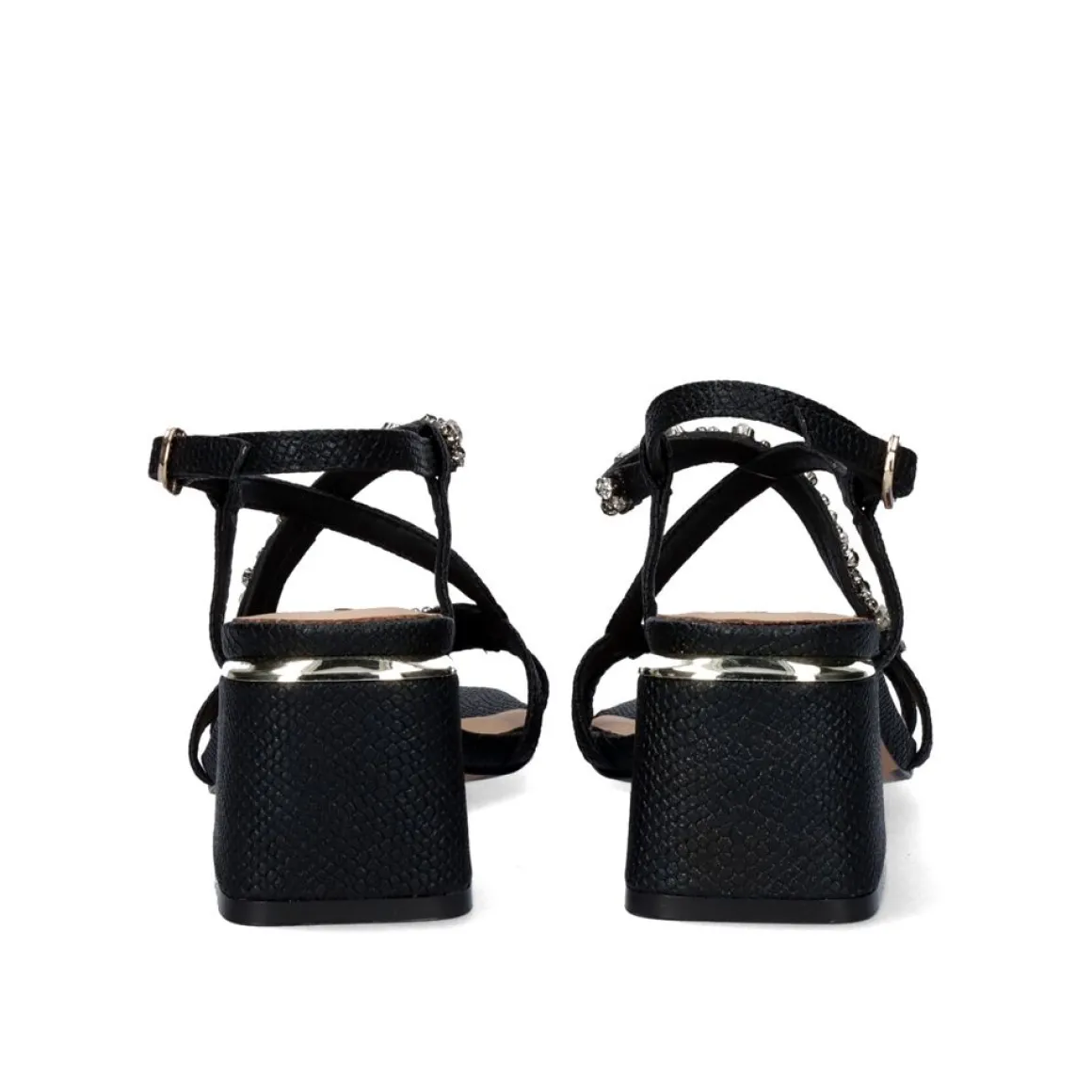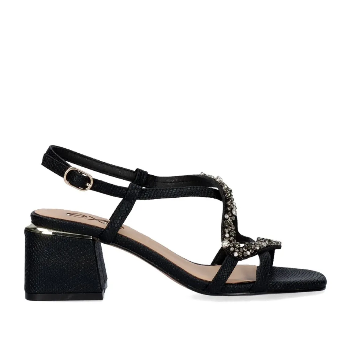 Sandalia De Salto Baixo Fechada No Tornozelo Com Fivela Preta Com Acabamento Em Cobra E Detalhe De Tira Brilhante. A Altura Do Salto E De 5,5 Cm.