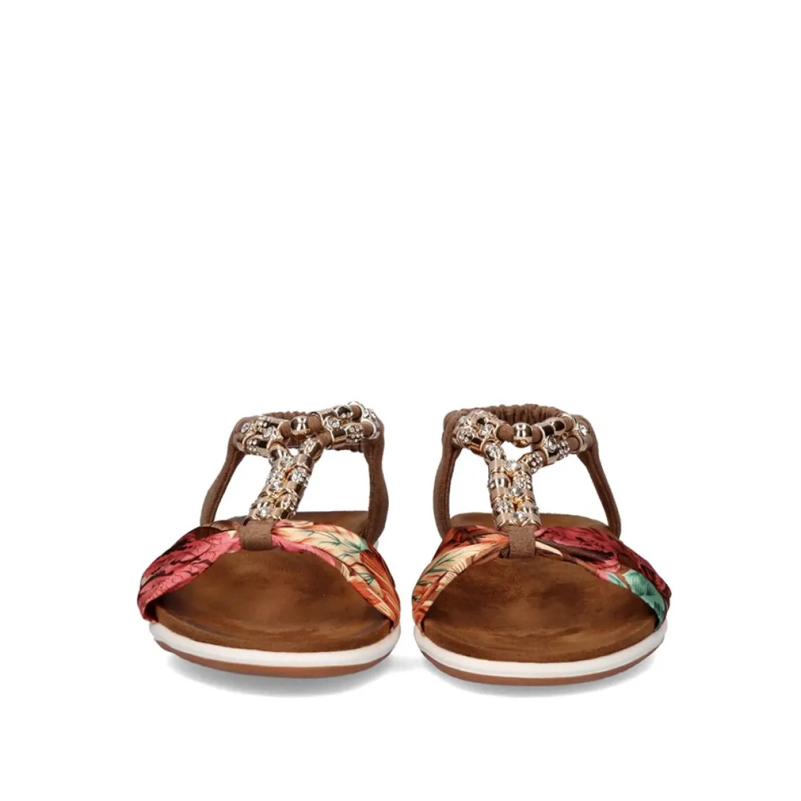 Sandalia Rasa Sintetica Marrom Com Detalhes Em Strass Nas Tiras E Detalhes Multicoloridos Na Tira Frontal.