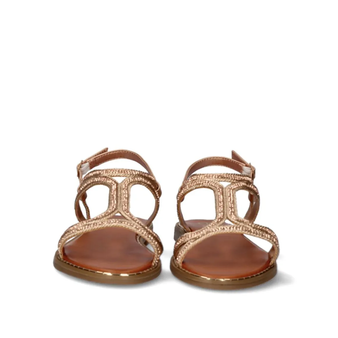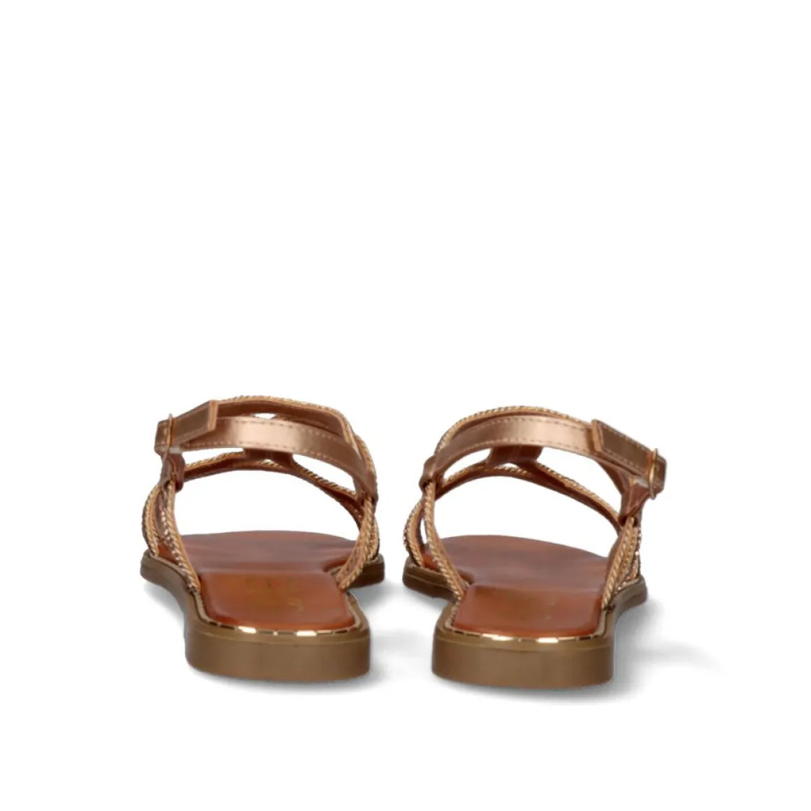 Sandalia Rasa Sintetica Na Cor Ouro Rosa Com Fecho No Tornozelo Com Fivela E Detalhes Brilhantes Nas Tiras.