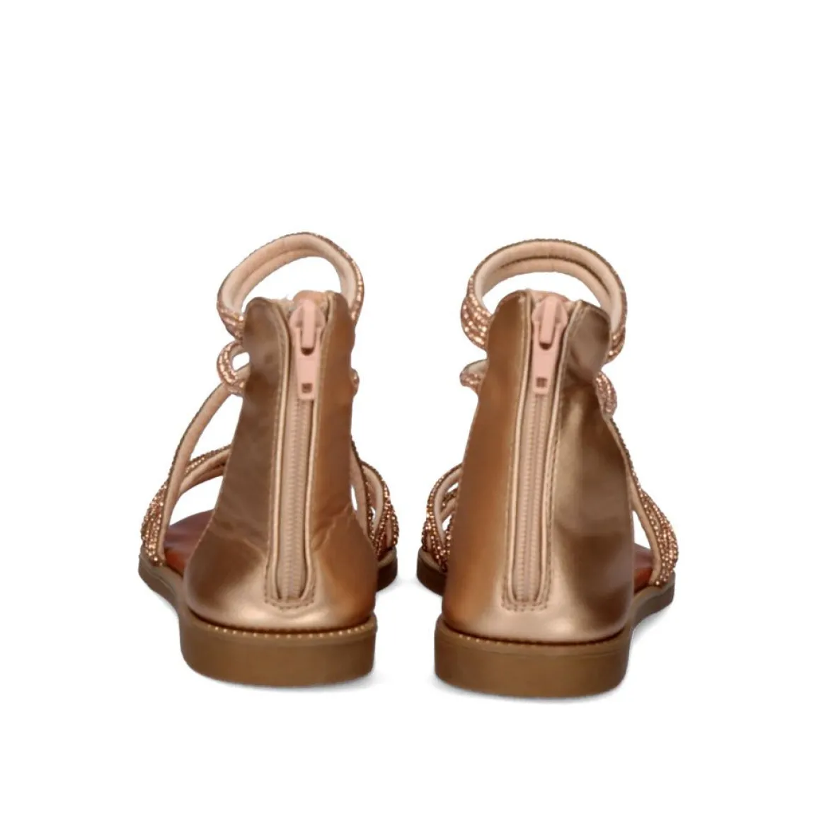 Sandalia Rasteira Sintetica Na Cor Ouro Rosa Com Detalhes De Cristais Brilhantes Em Todo O Peito Do Pe. Com Fecho De Ziper Na Parte De Tras Para Maior Suporte No Tornozelo.