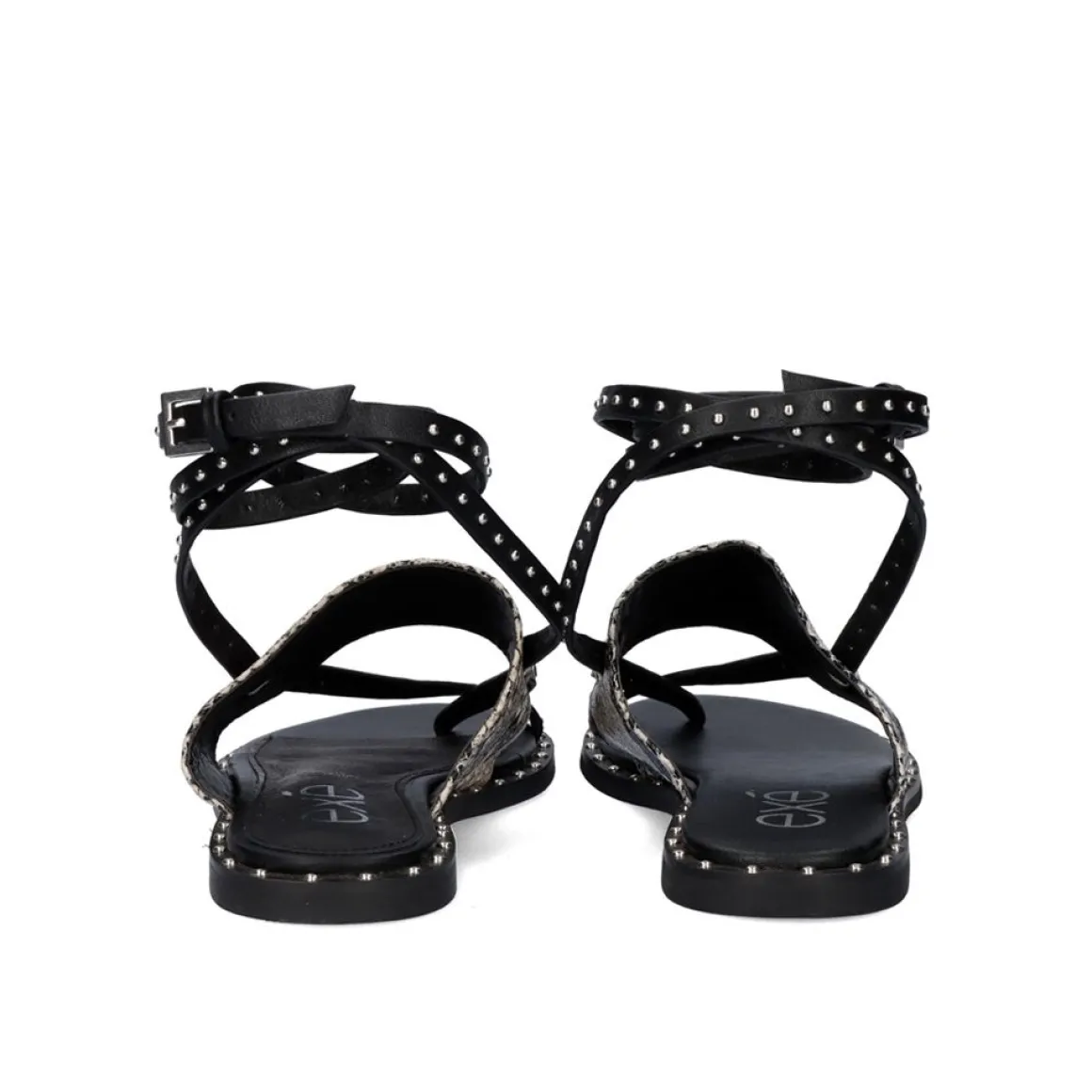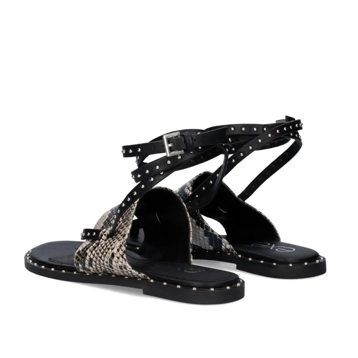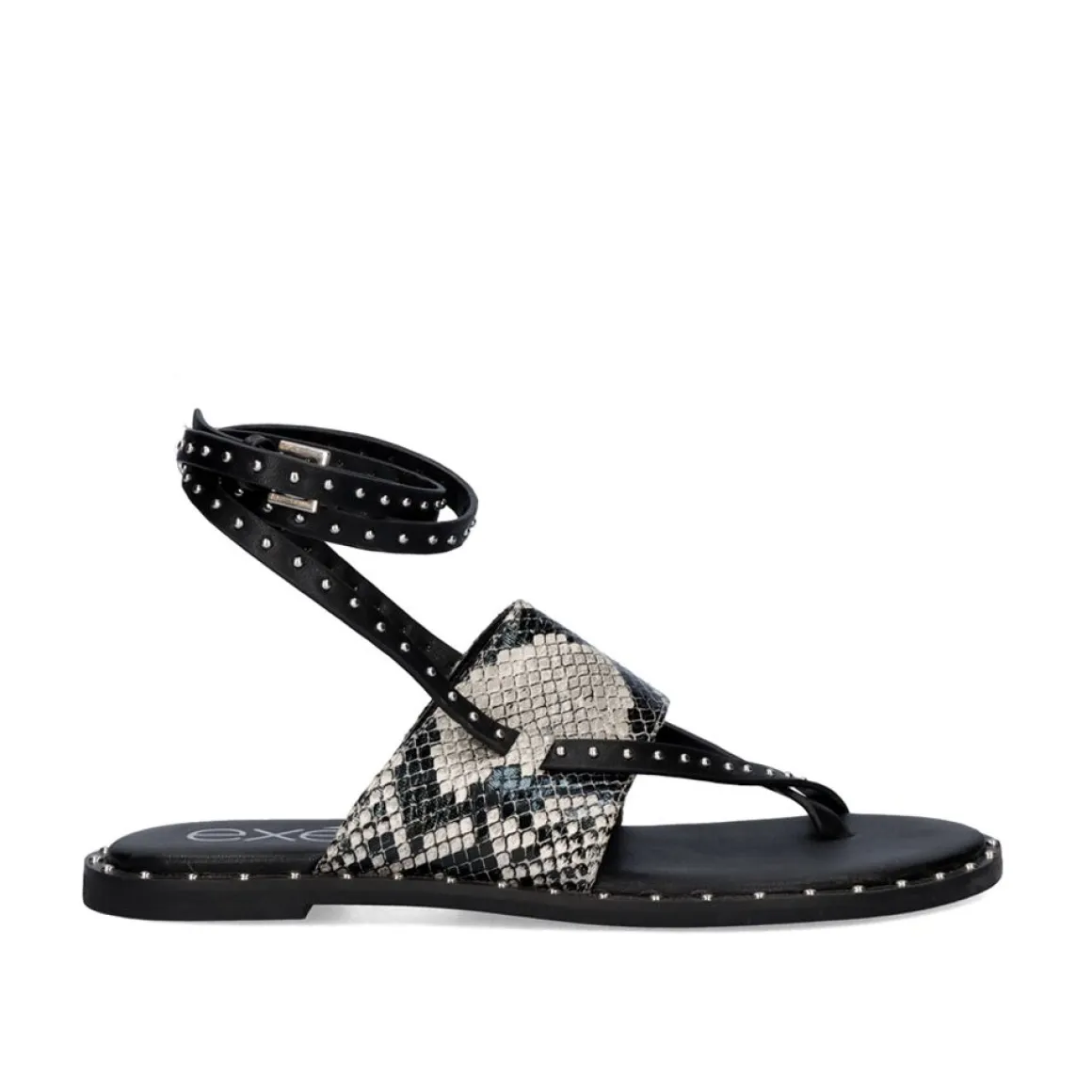Sandalia Plana Com Rebites Prateados No Chao E Finalizada Em Sanake. Tem Uma Faixa Larga Que Segura O Passo E Dois Finos Com Ornamentos Prateados Que Cruzam O Pe Inteiro E Sao Unidos No Tornozelo Com Uma Fivela De Prata.