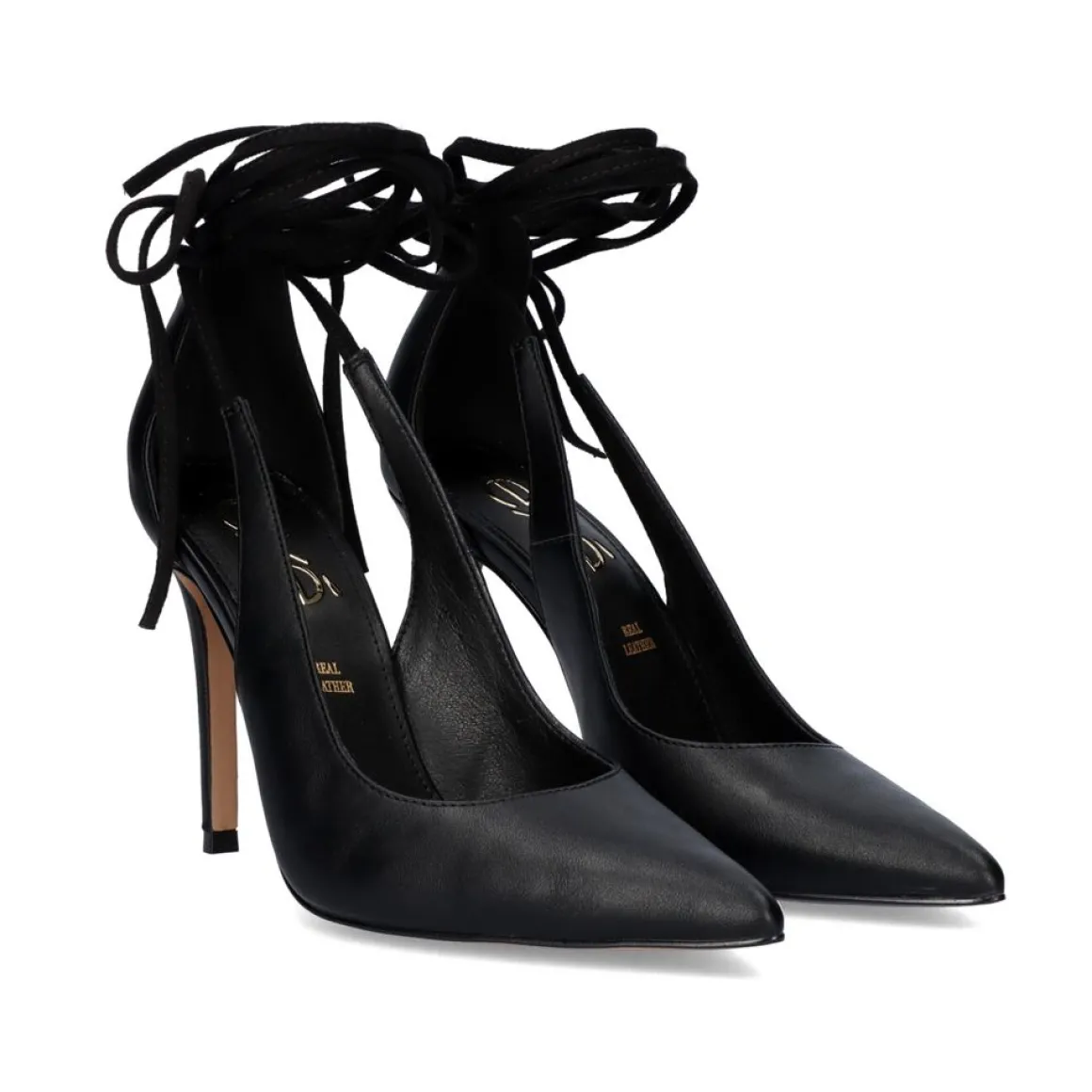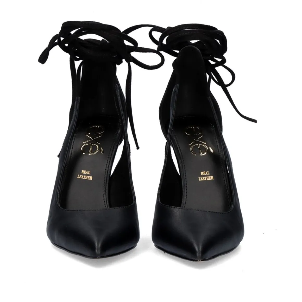Sapato Descascado Em Preto Com Salto De 10 Cm De Altura, Com Tiras De Atadura. Sola Sintetica, Corte De Sapatilha E Sola De Couro.